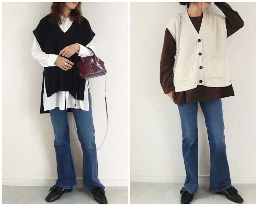 このデニム、お洋服を選ばず何とでも合わせやすいのですが、秋は流行りのベストとコーディネートするのもおすすめ