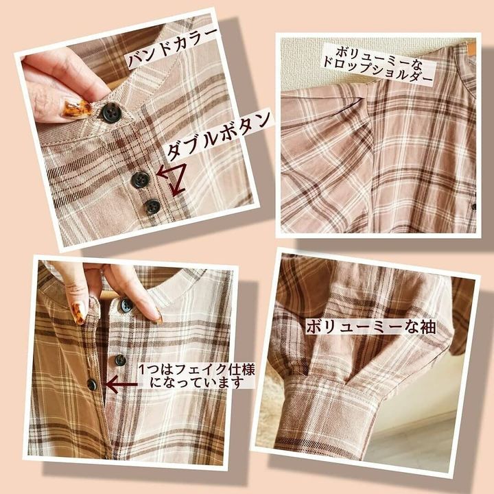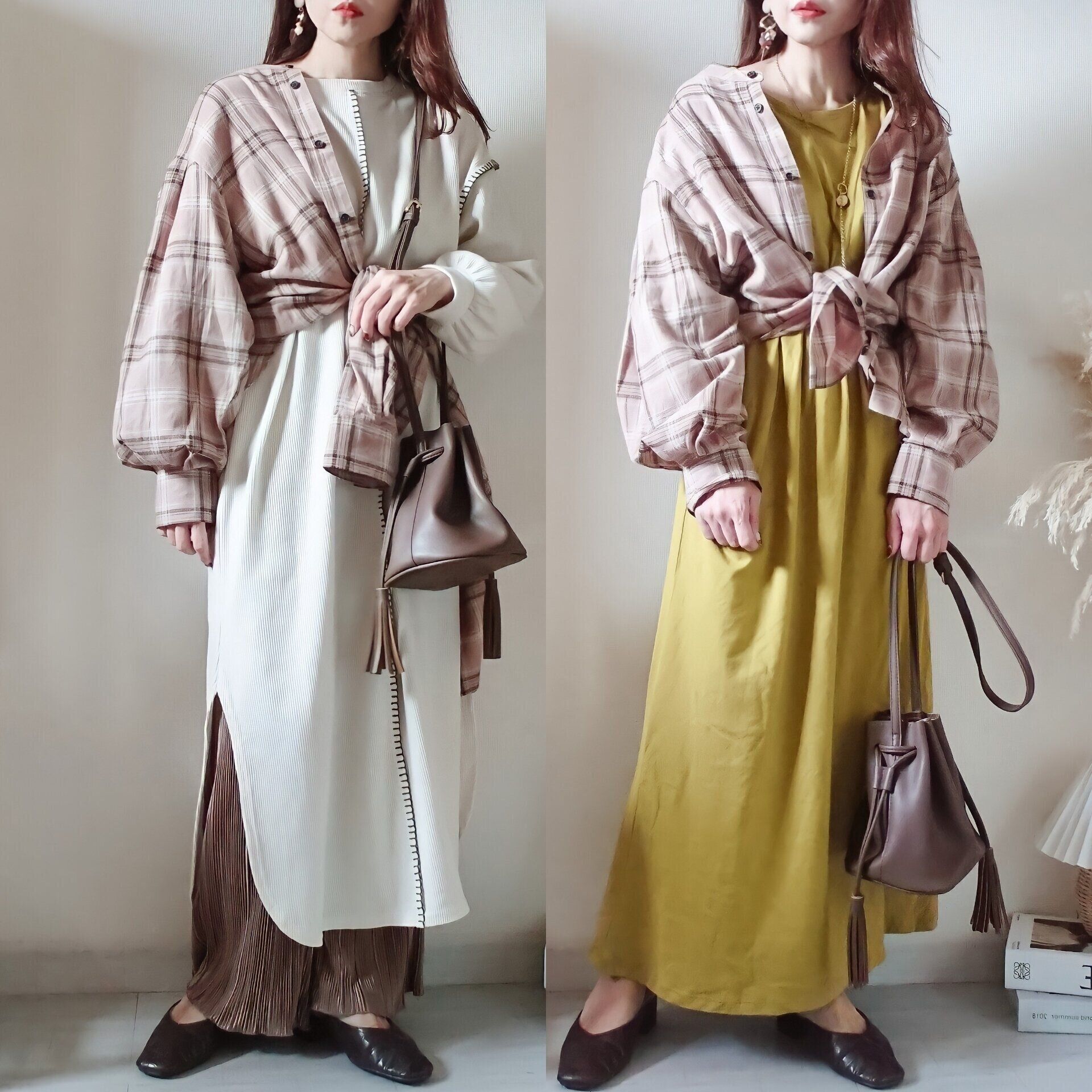 どちらのコーデもベージュのチェックシャツに馴染む淡色系カラーでまとめています。この方が抜け感が出てオシャレ度が増します!(ワンピース・しまむら)