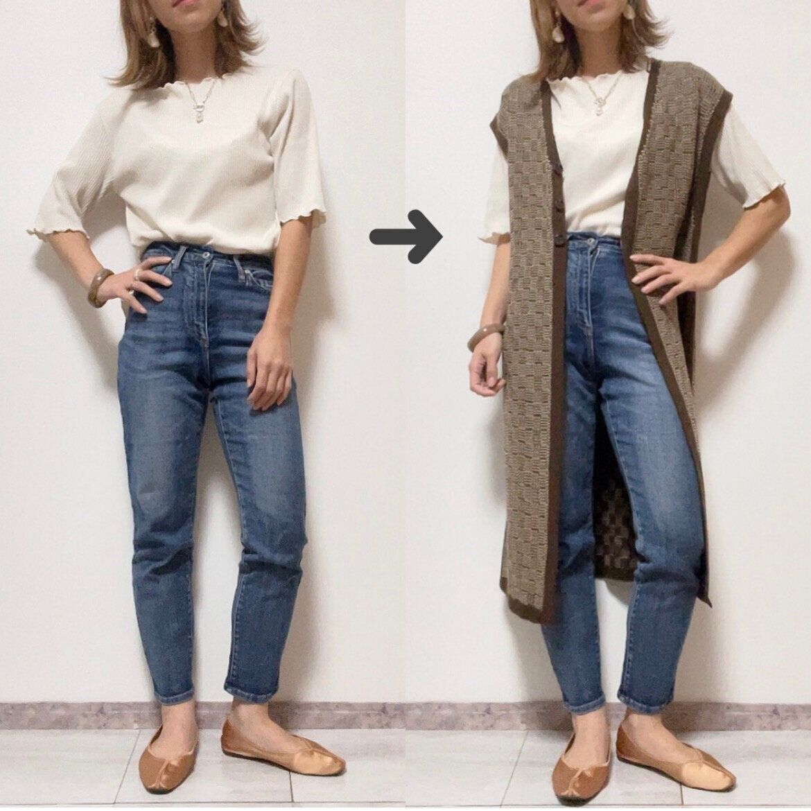 白トップスにデニムという簡単なカジュアルコーデが、ジレを羽織るだけで一気に秋の高見えコーデに変身しました。