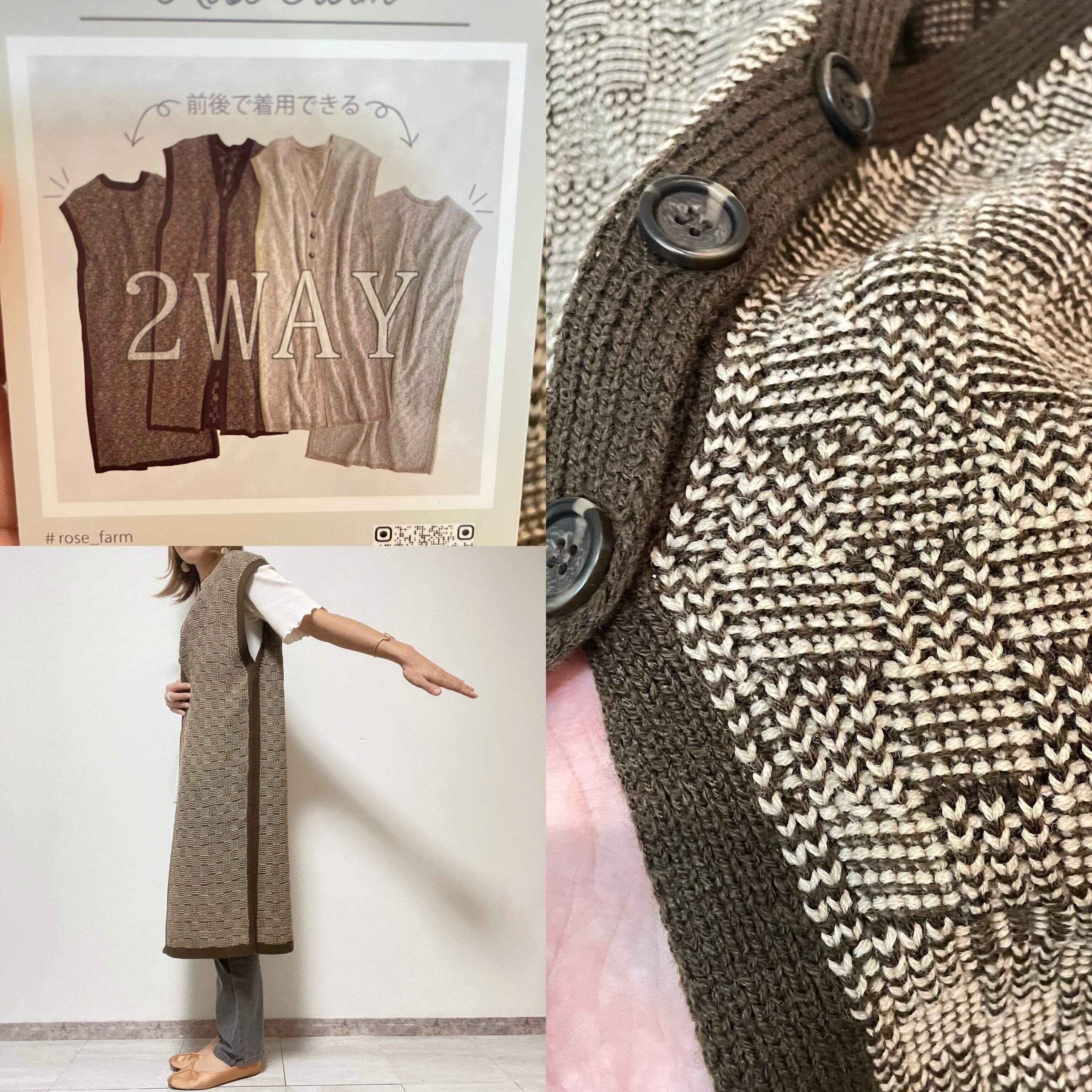 前後2wayで使用できるこちらのニットジレはアクリル100%でウールに近い生地感。