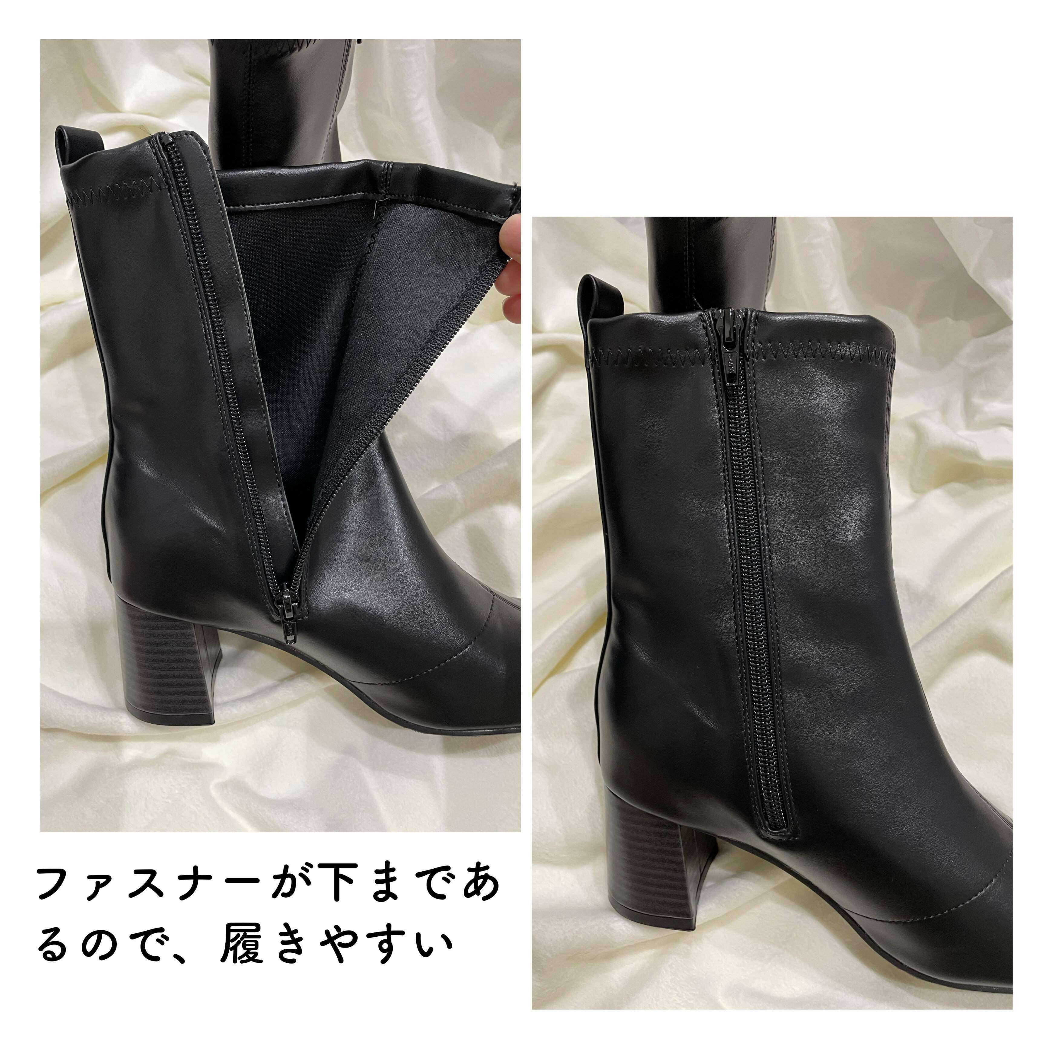 ブーツの脱ぎ履きも、しっかりと下までファスナーがついているので、らくらくとできますよ。そして、生地も柔らかい合皮素材で、足にピタッとフィットする感じなので、スカートはもちろんの事、テーパード系のパンツでも合わせやすいです。