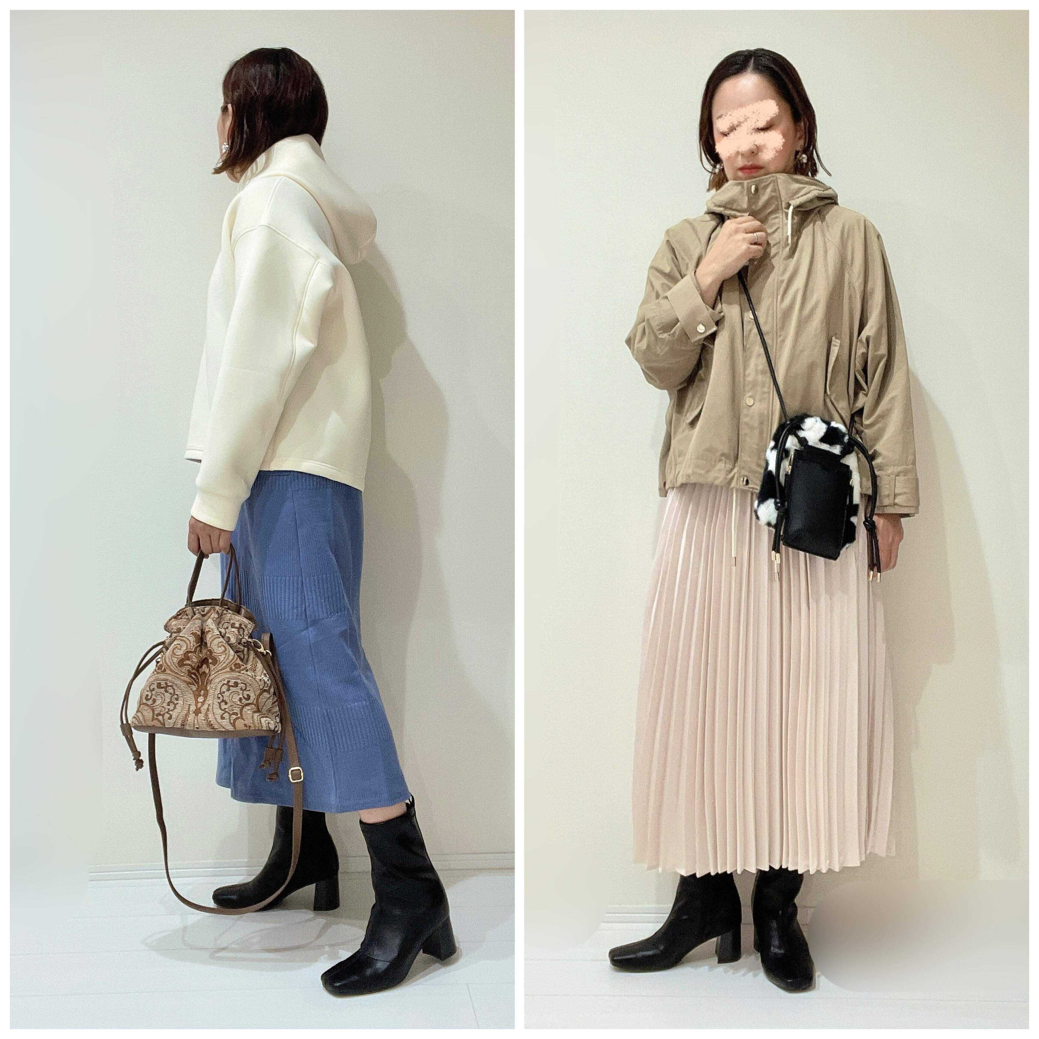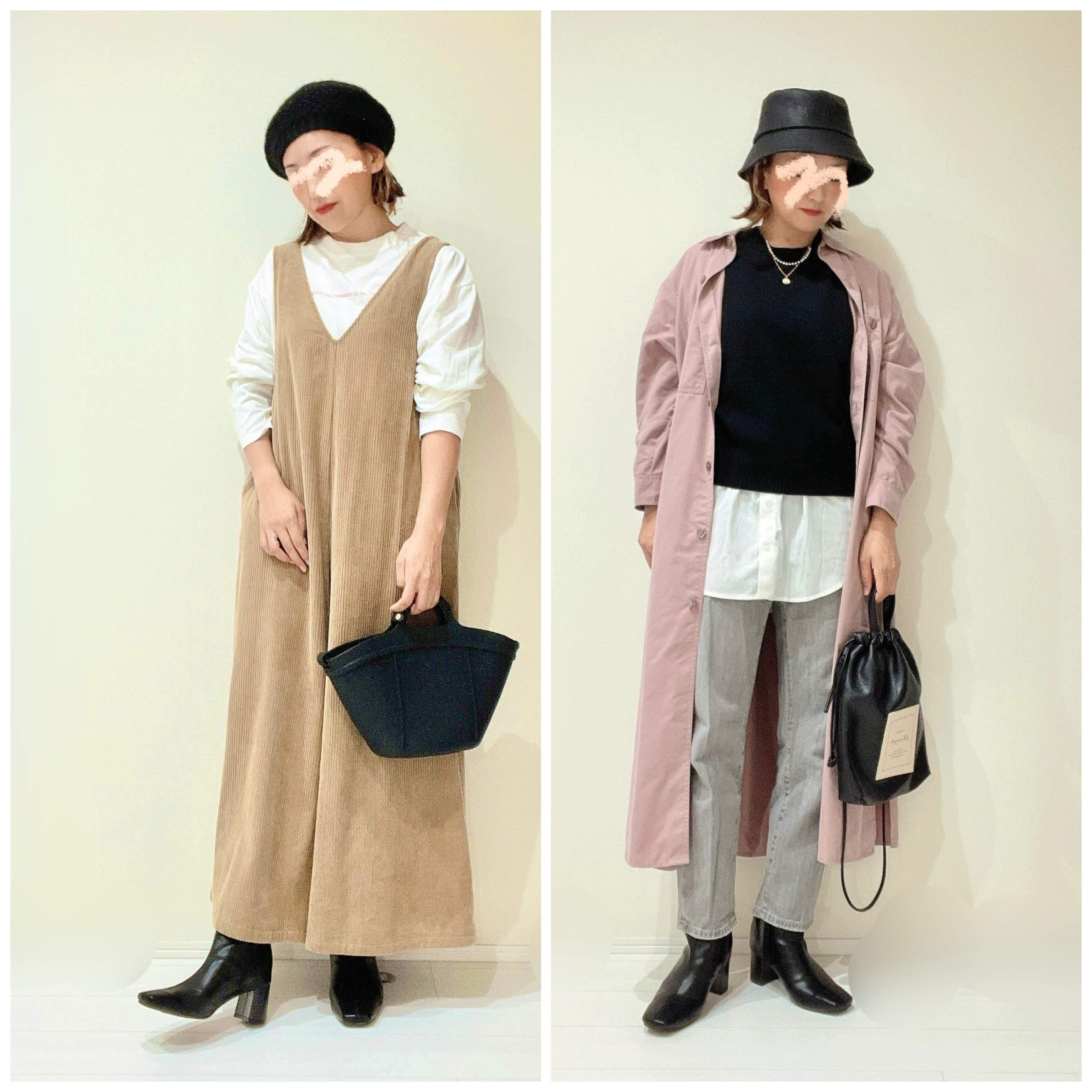 足元が黒なので、真ん中(バッグ)と顔まわり(帽子)にも黒を持ってくると、一気に秋冬モードになります。ワイドパンツにも、裾が締まったパンツにも、とにかくどんなボトムスでも合わせやすいのが特徴です。