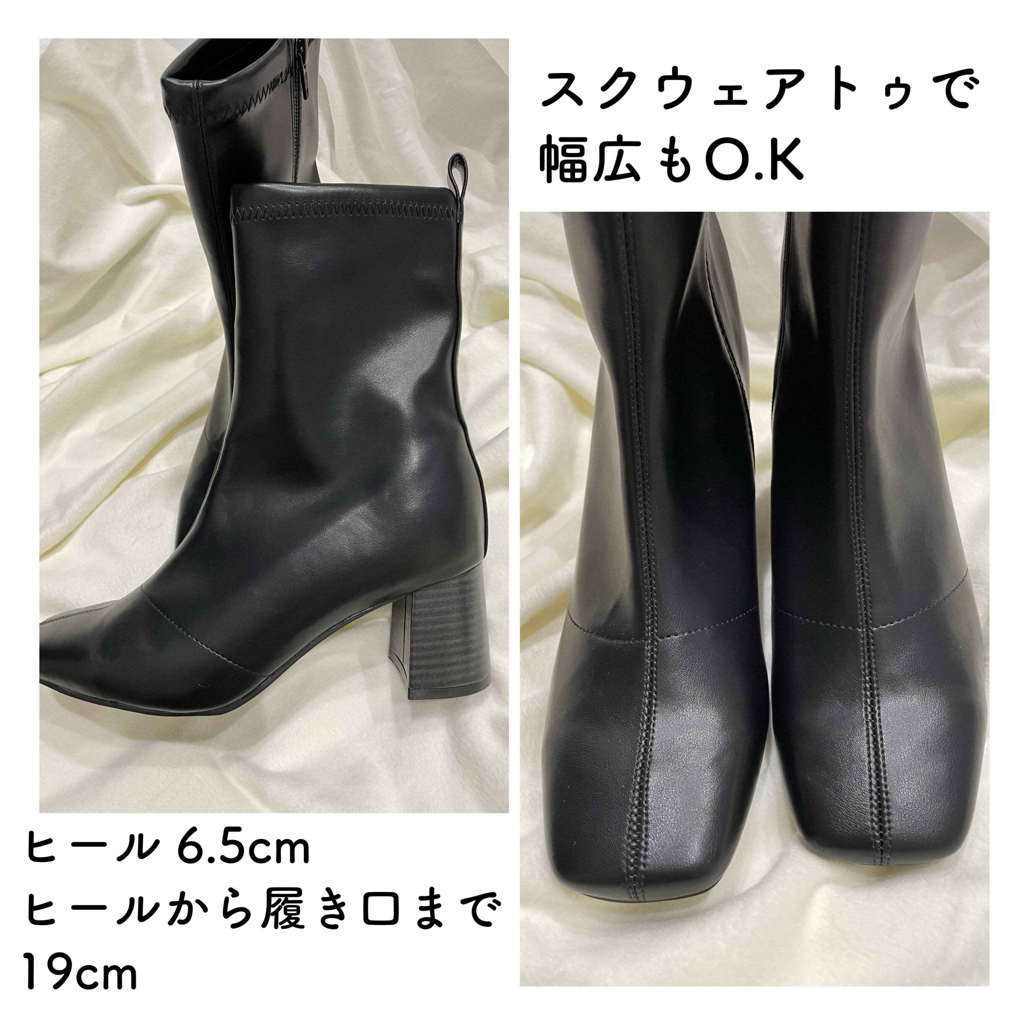 私が惹かれたのはなんといっても、このスクウェアトゥ。外反母趾の私はこれに弱いんです。足が幅広の私でもラクに履け、中敷きはフワッとしており、全体的な素材もストレッチが十分効いています。そして、ヒールの高さは6.5cmですが、チャンキーヒールのお陰でヒールの安定性があり疲れにくいですよ。