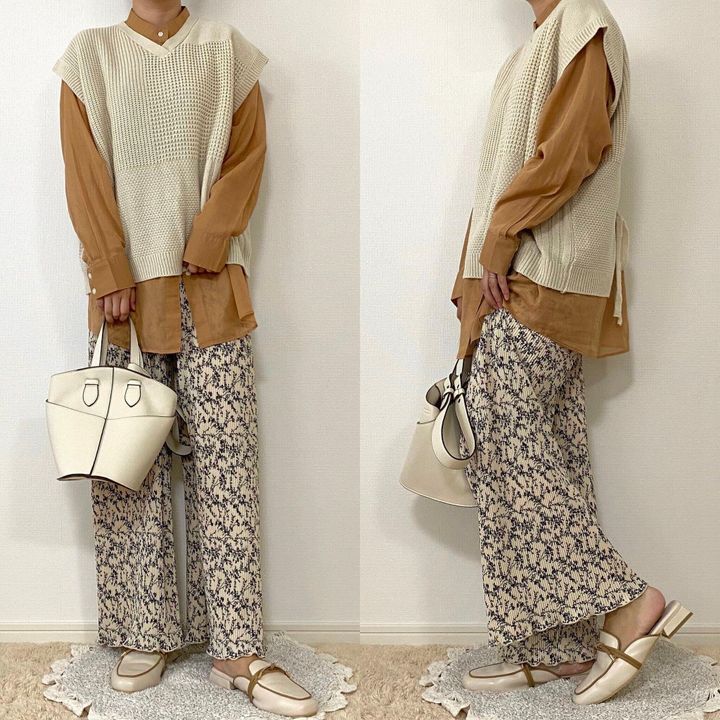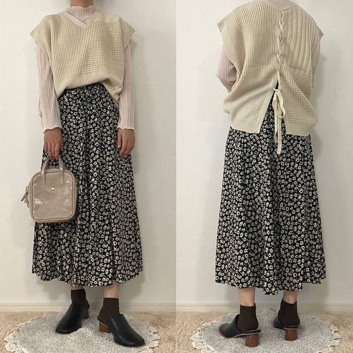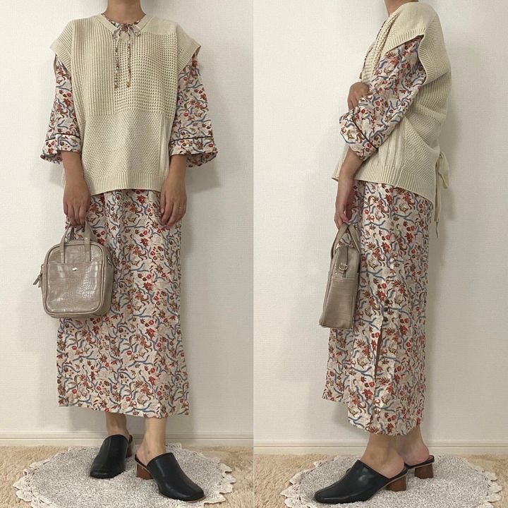 普段使いするにはきれいめすぎて着る機会が少なかった総柄のワンピースも、ベストを重ねることでカジュアルダウンされて活躍の機会が増えそうです!