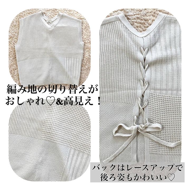色は合わせやすそうなベージュをチョイスしました。一見シンプルなベストにも見えますが、フロントもバックも編み地が切り替えになっており、パッチワークのようにいろんな編み地が繋ぎあわせになっていてとても高見えです。