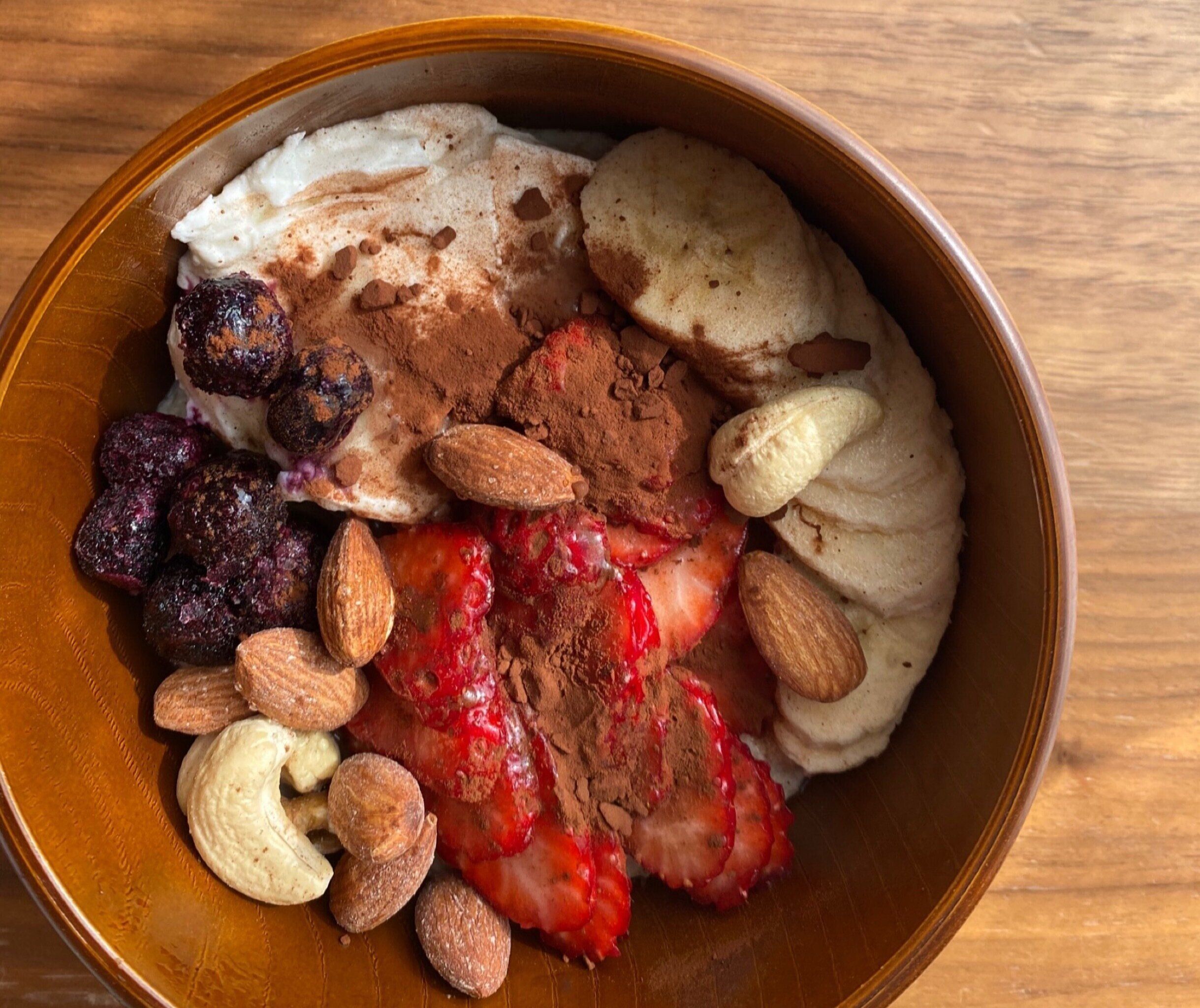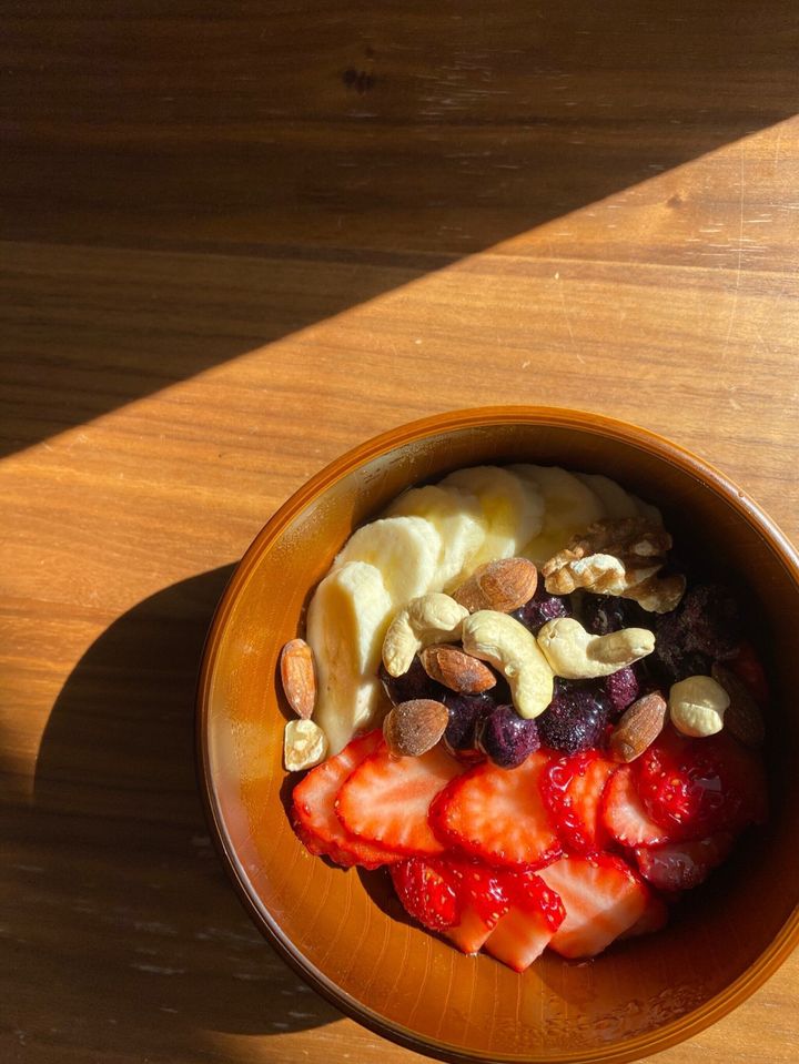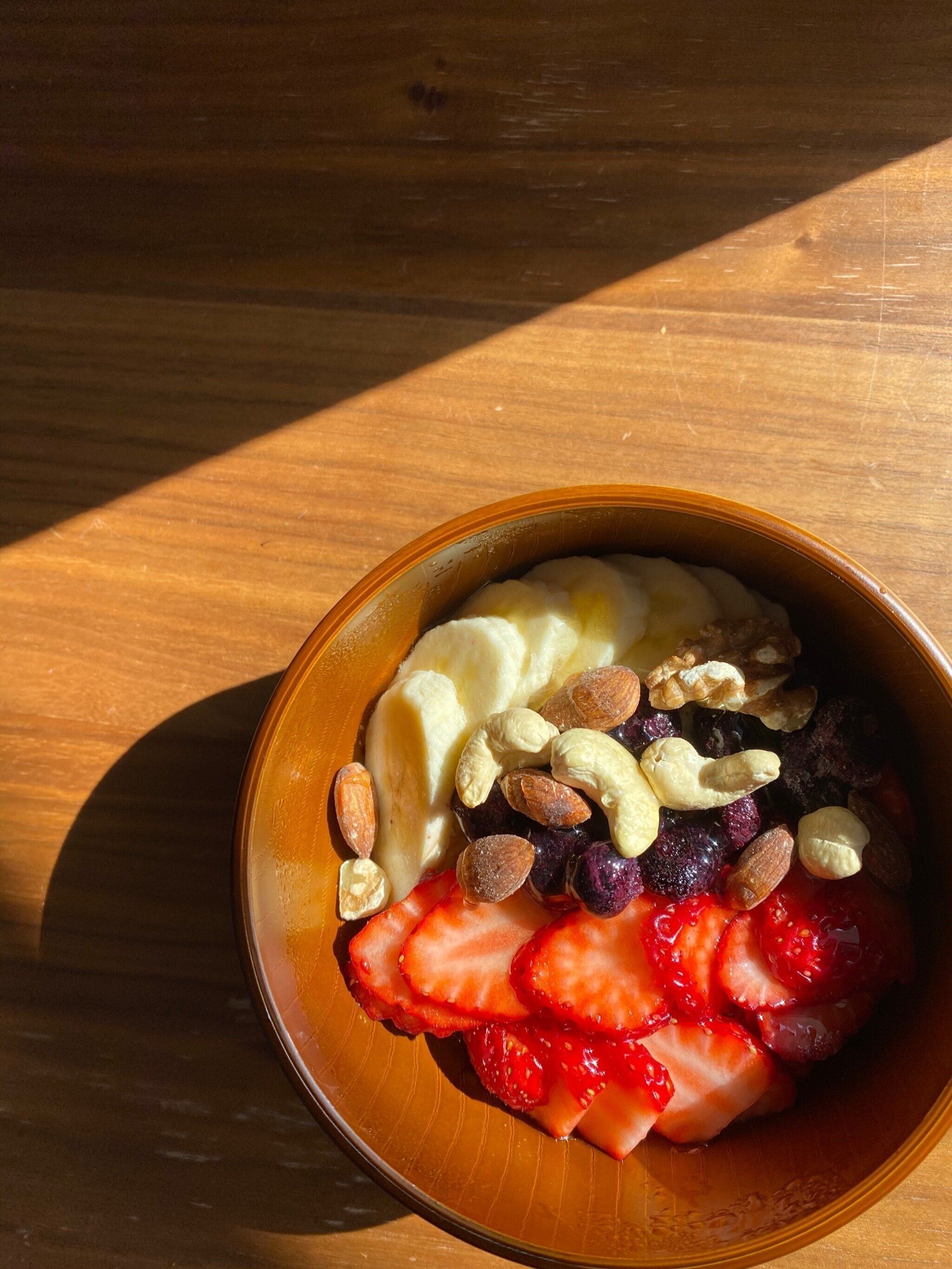 そこにお好みのフルーツやハチミツなどをトッピングすれば完成。朝日に当てて写真を撮るととってもインスタ映えする朝食です!