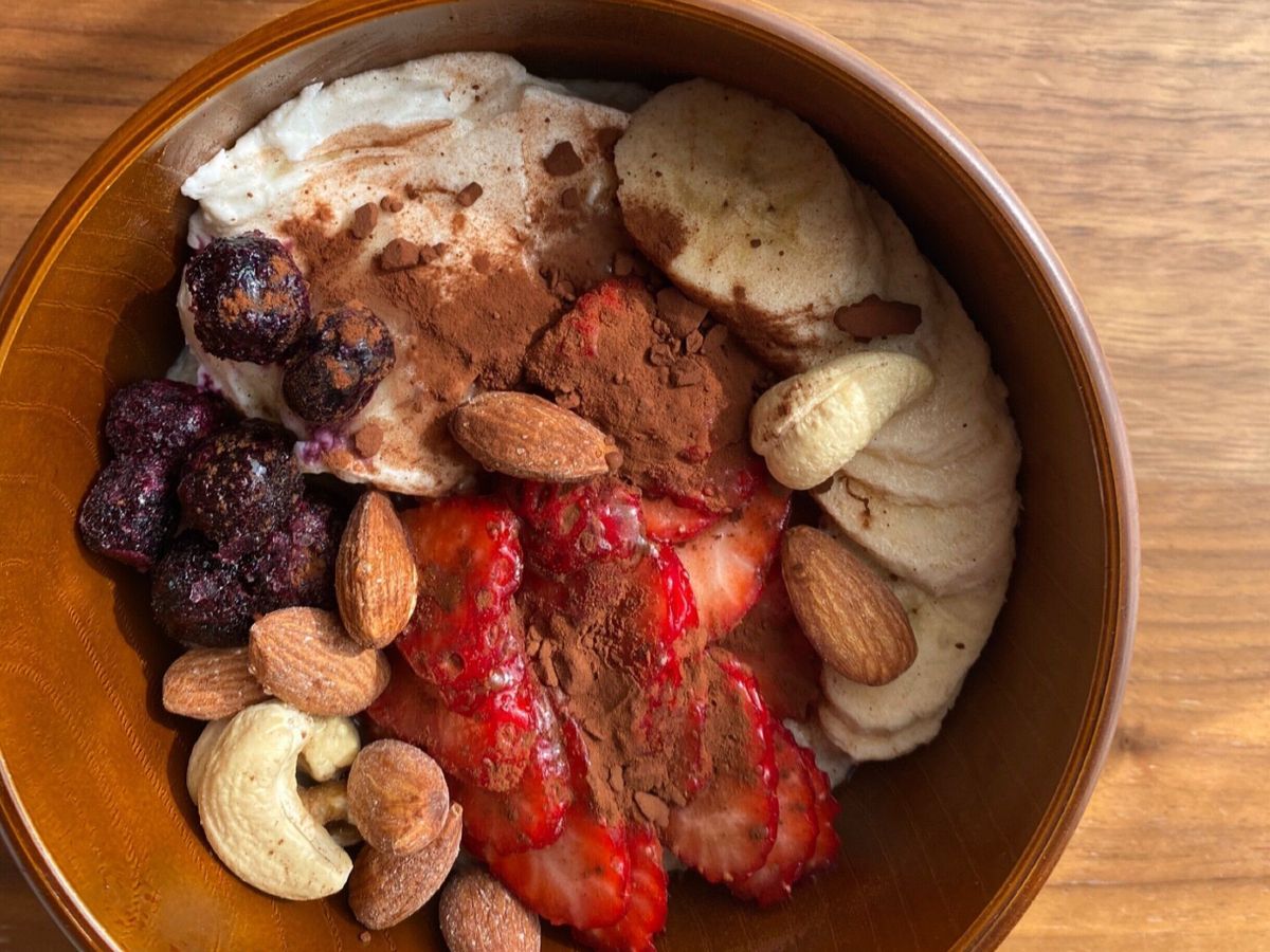 私はアーモンドミルクと小さいパックのヨーグルト(スーパーによく売っている4つに分解できるタイプ)を1つ混ぜ、その日の好みで純ココアだったり、冷凍フルーツを混ぜて一晩寝かせていました。
