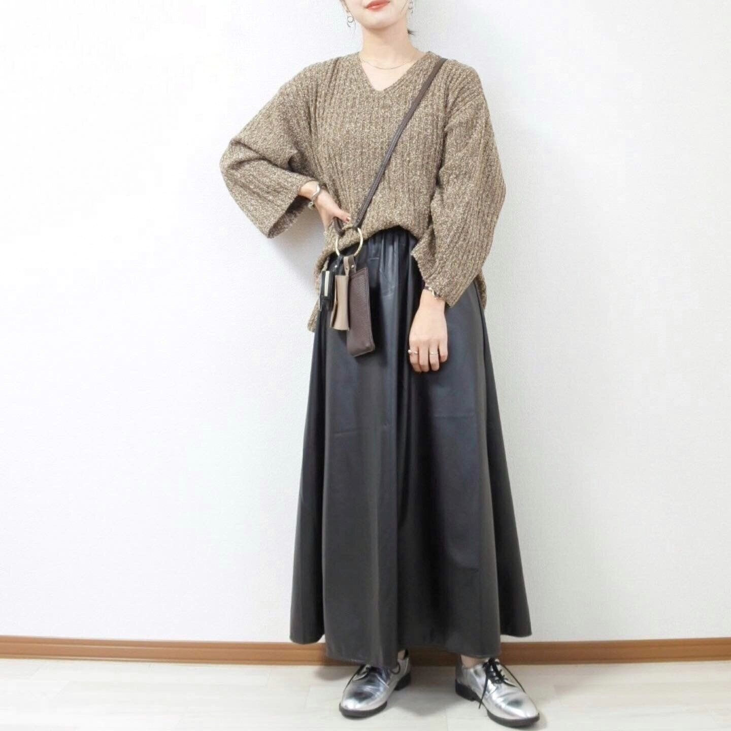 柔らかい印象のニットコーデが一気に引き締まる、上級者アイテムのレザースカート。