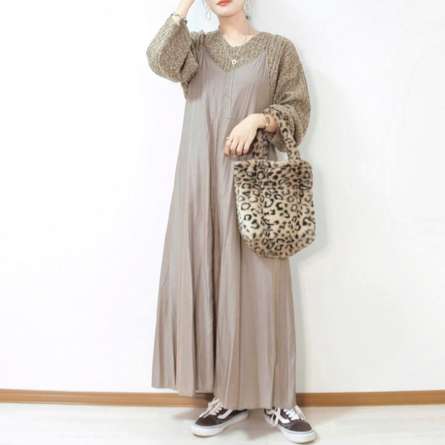 同系色のキャミワンピースと合わせてワントーンコーデにまとめると、ぐんと大人っぽくまとまります。