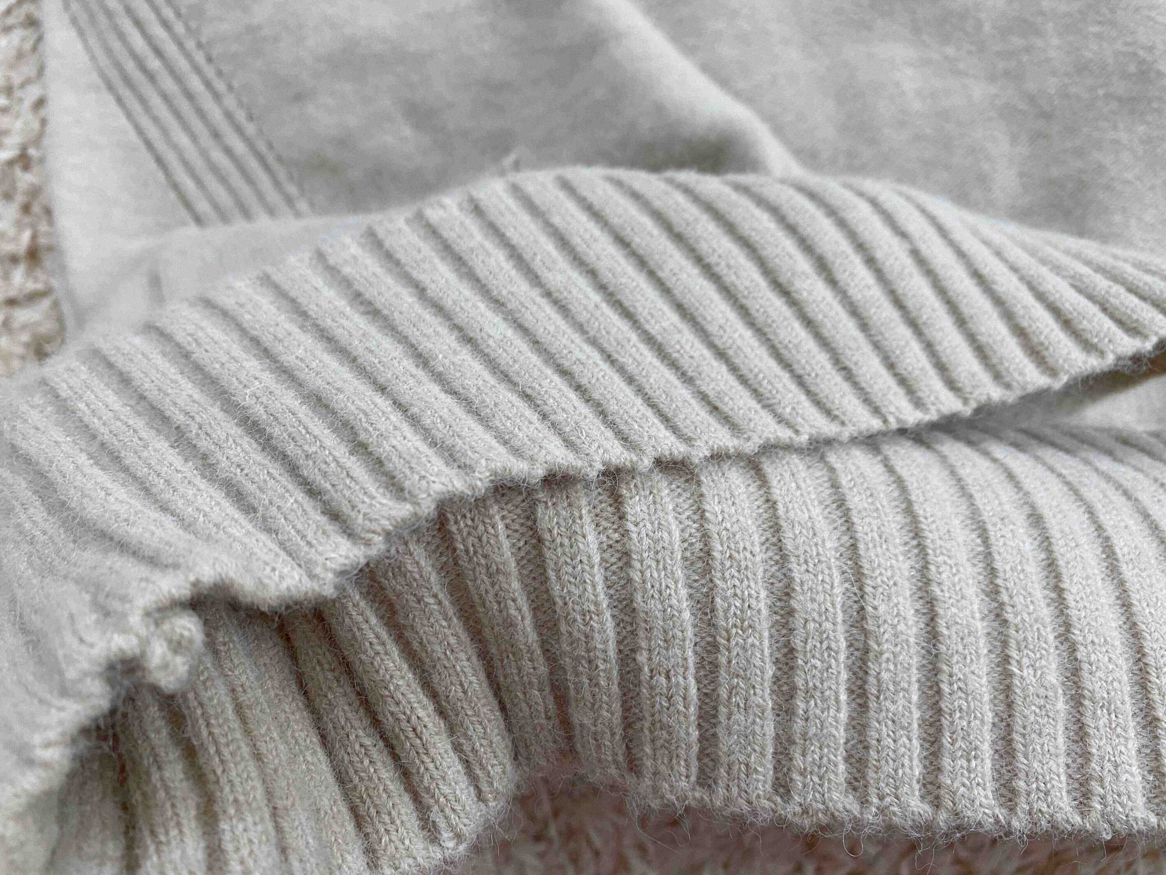 リブ編み柄もさりげなく、カラーも落ち着いたベージュなのでどんなアイテムとも合わせやすいです。
