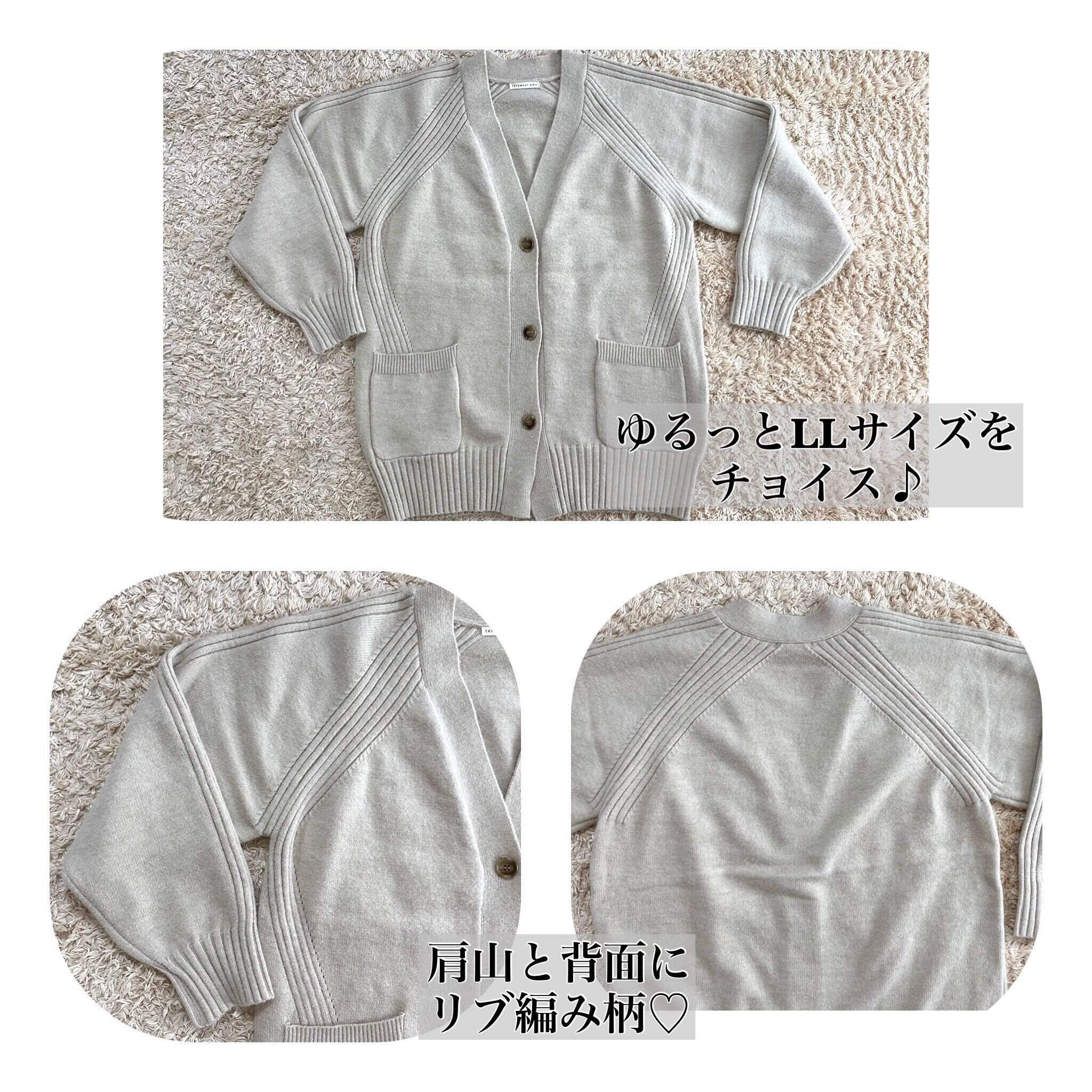 サイズはLLサイズをチョイス。袖やすそ、肩山にもリブ編み柄がありシルエットにメリハリを作ってくれるので大きめサイズでもルーズになりすぎずに着ることができます。