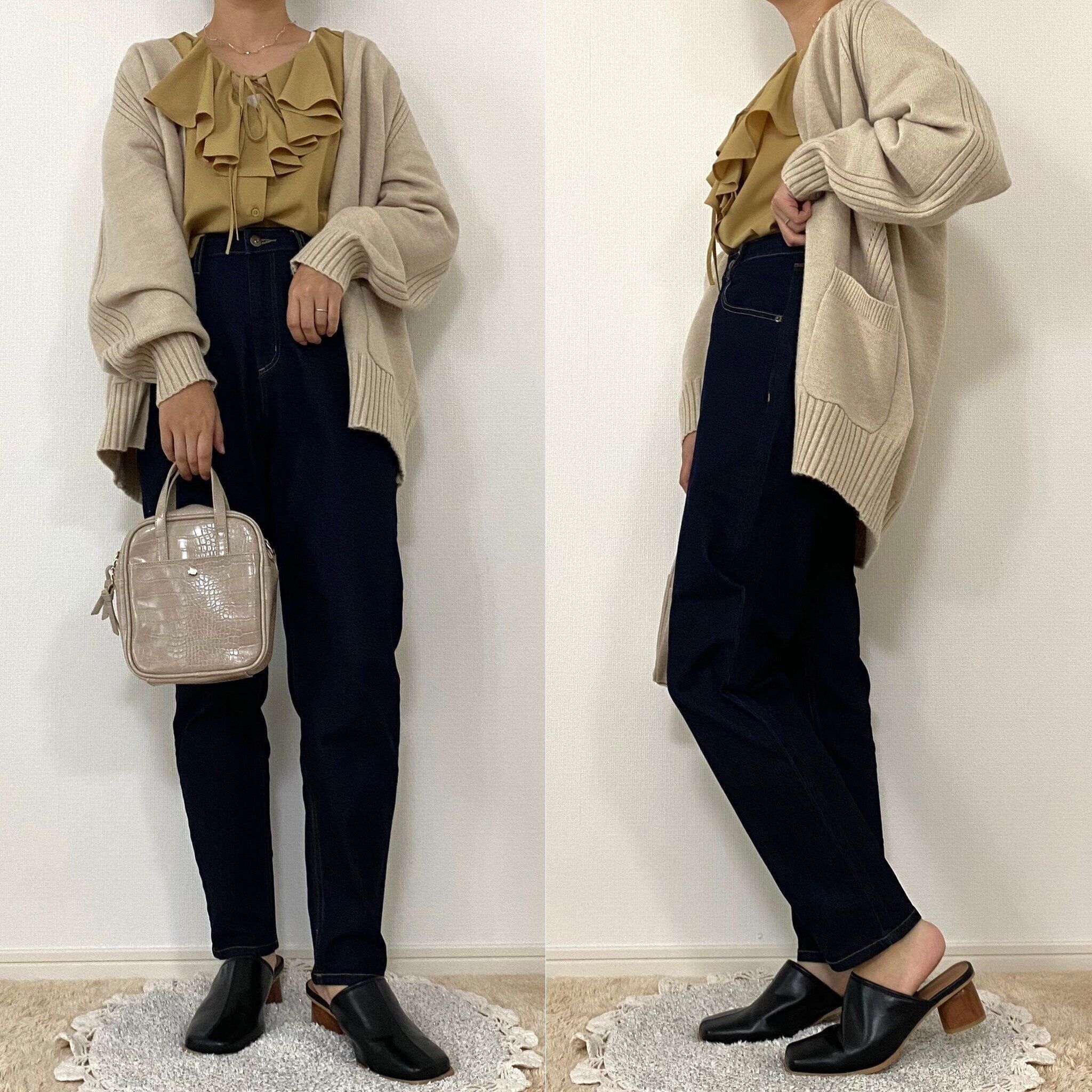 すっきりとしたシルエットのテーパードデニムと合わせるとカーデのゆるっとしたシルエットが際立ってとてもかわいいです。