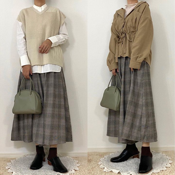 (右)ベージュのシャツとくすみグリーンのバッグで落ち着いたアースカラーコーデにも、グレンチェックを合わせると柄がポイントになるので地味になりすぎないコーデに。