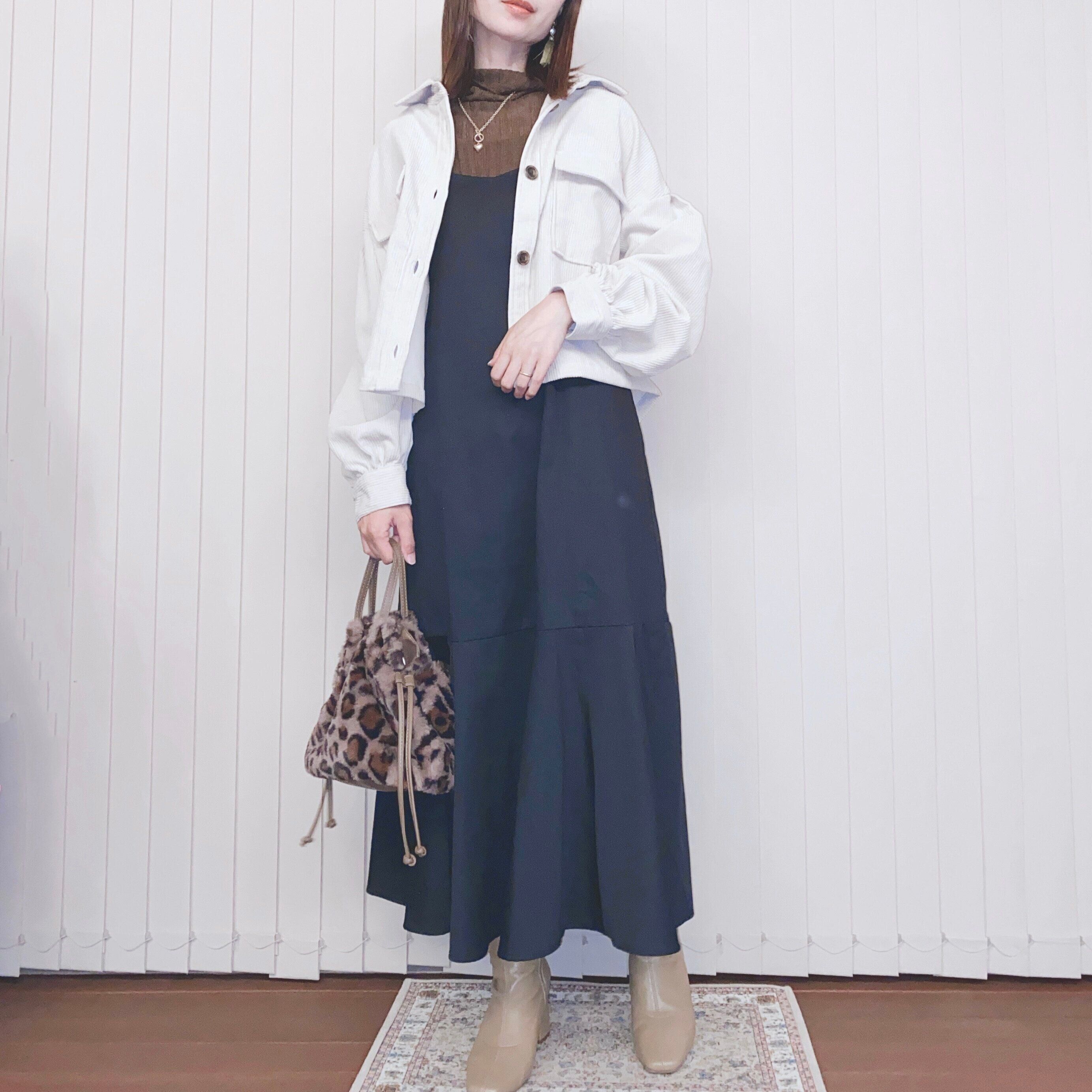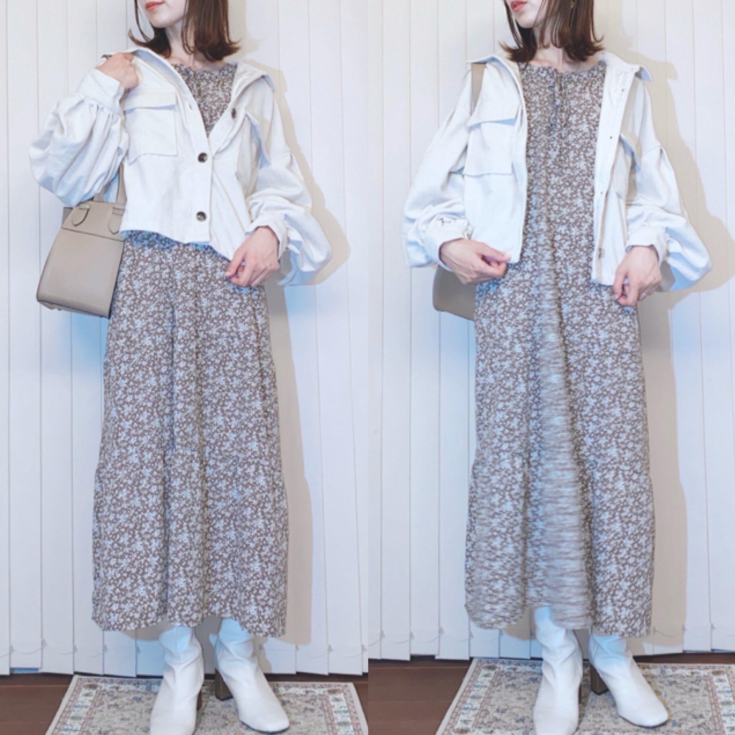 花柄ワンピースと合わせています。ブーツと色を合わせるとバランスが良くなります。