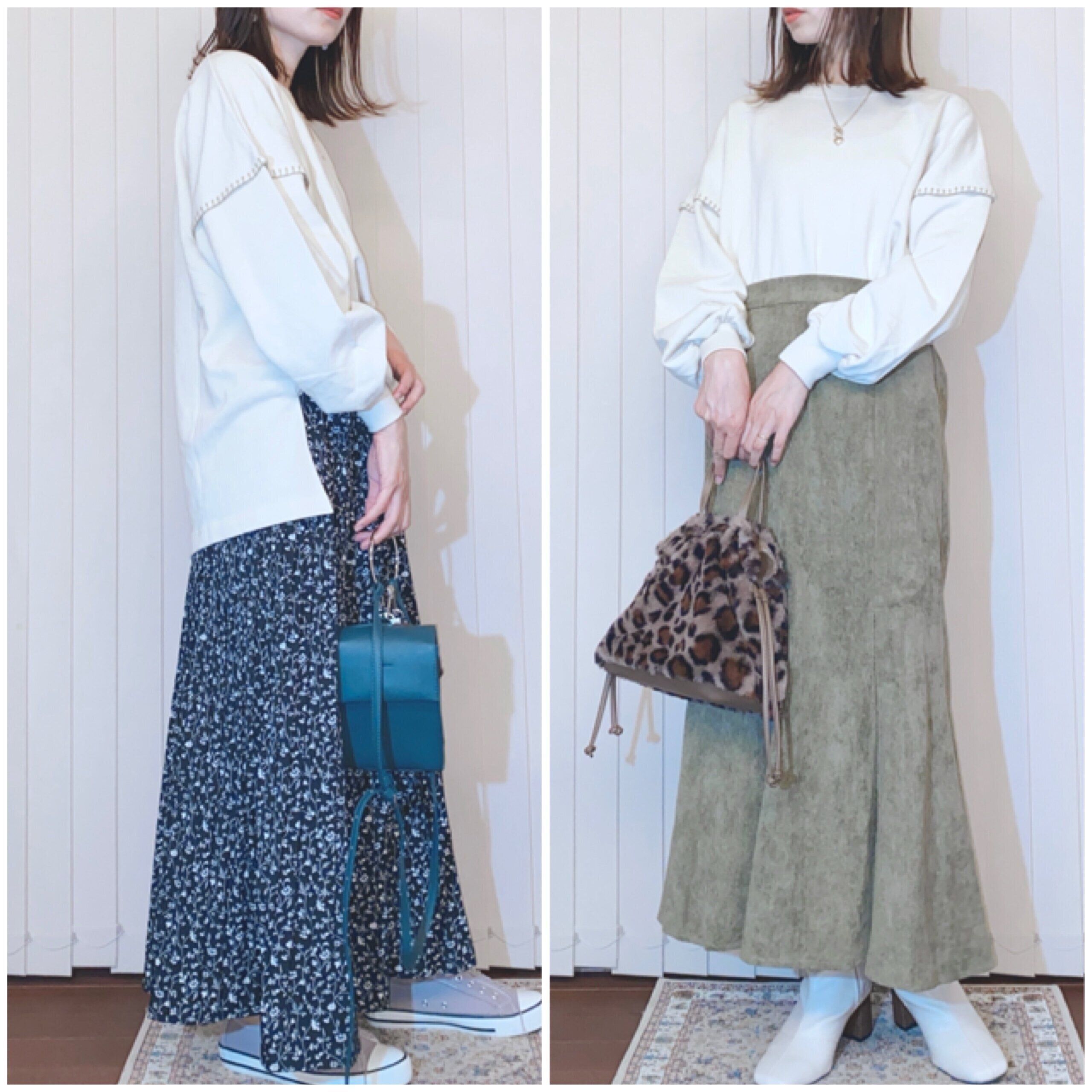 花柄プリーツスカートとコーデュロイマーメイドスカートと合わせたスタイルです。