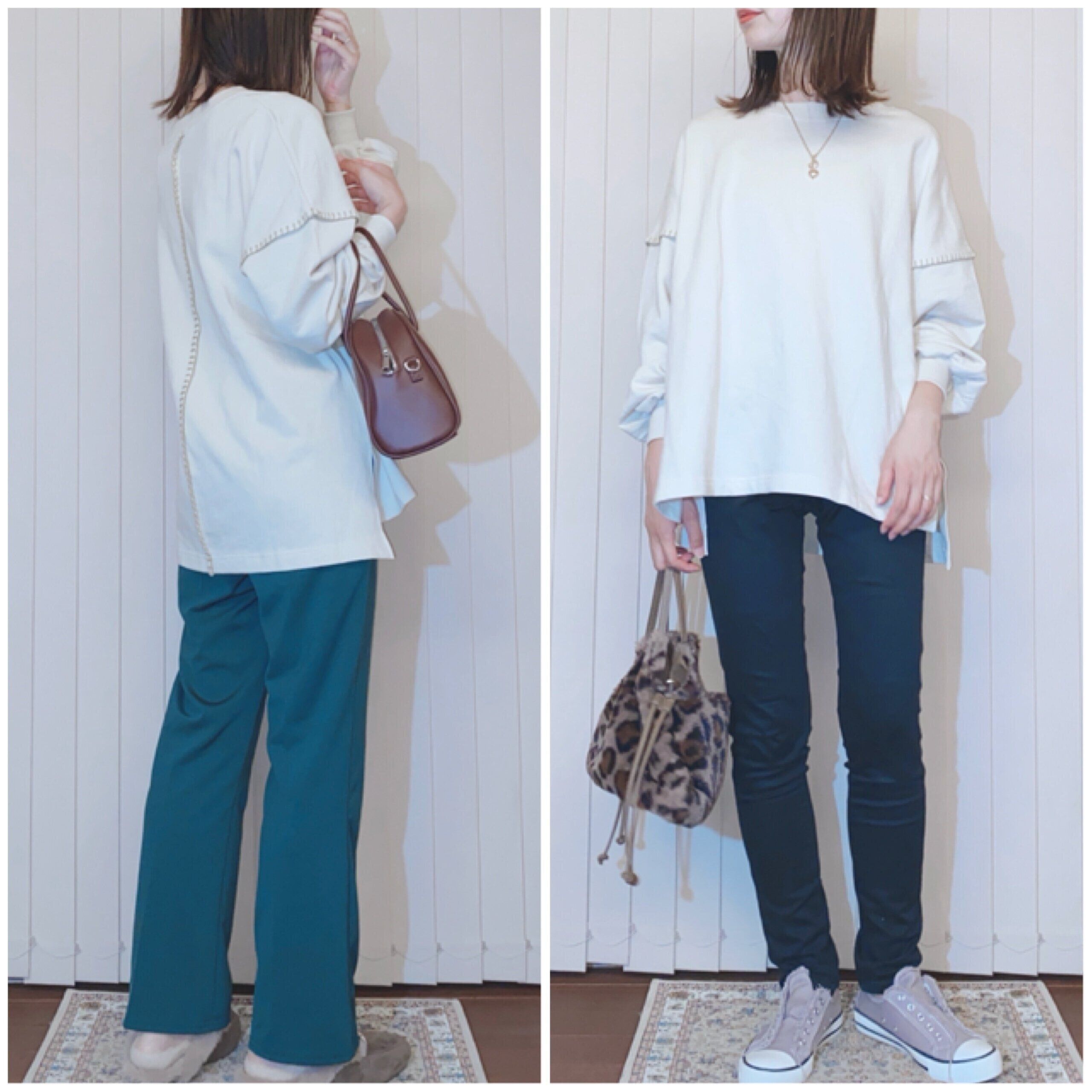 デザインが可愛いトップスなので、シンプルなパンツスタイルでもオシャレな装いになります。
