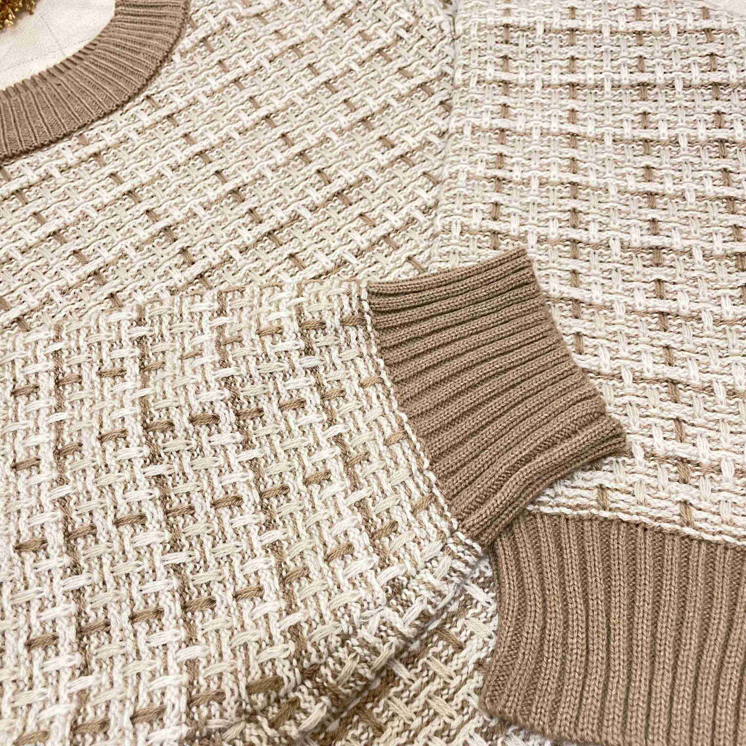 ブラウン・ベージュ・オフホワイトの糸がしっかりと編み込まれているツイードデザイン。この細かい色彩の模様がツイードニットの特徴であり、魅力ですよね。