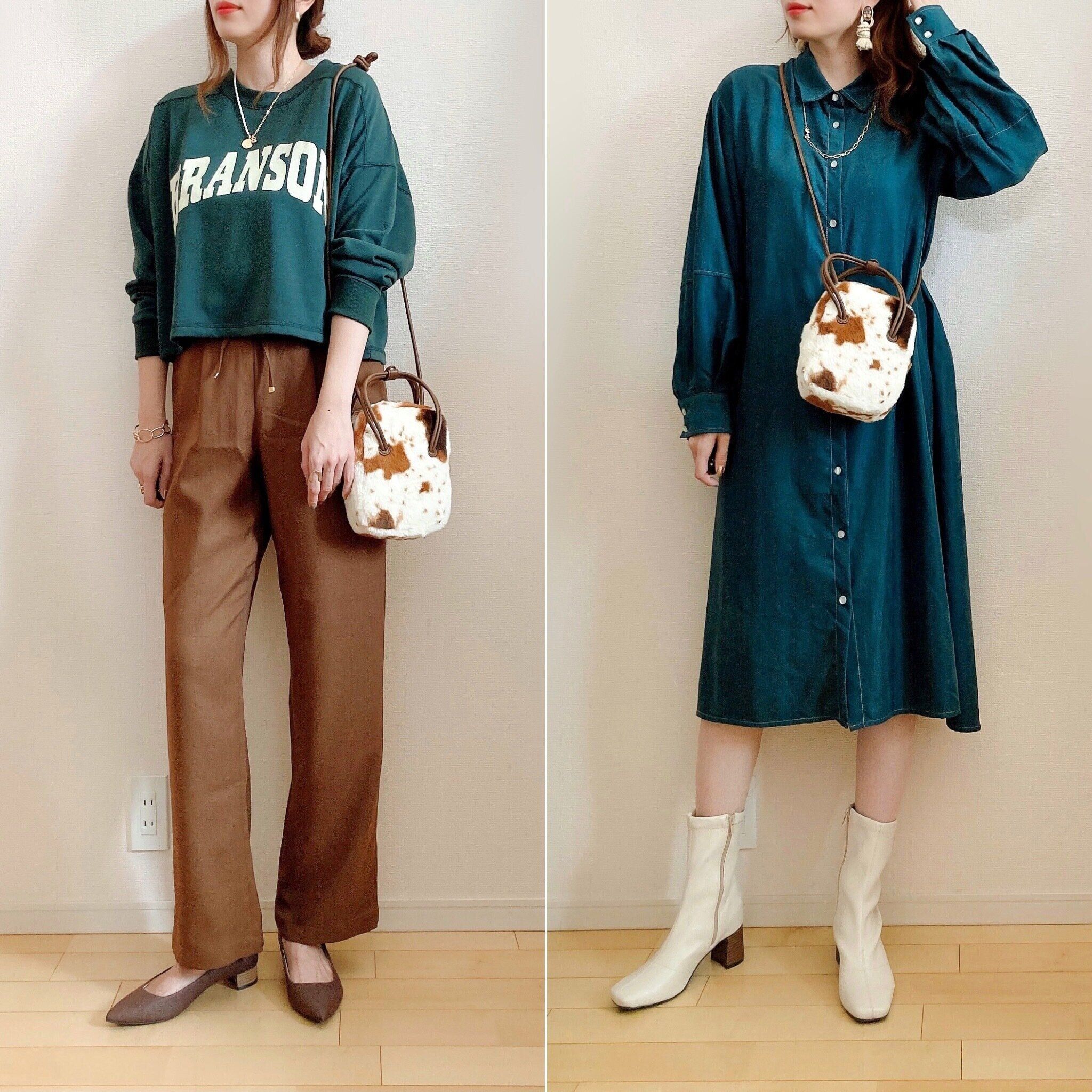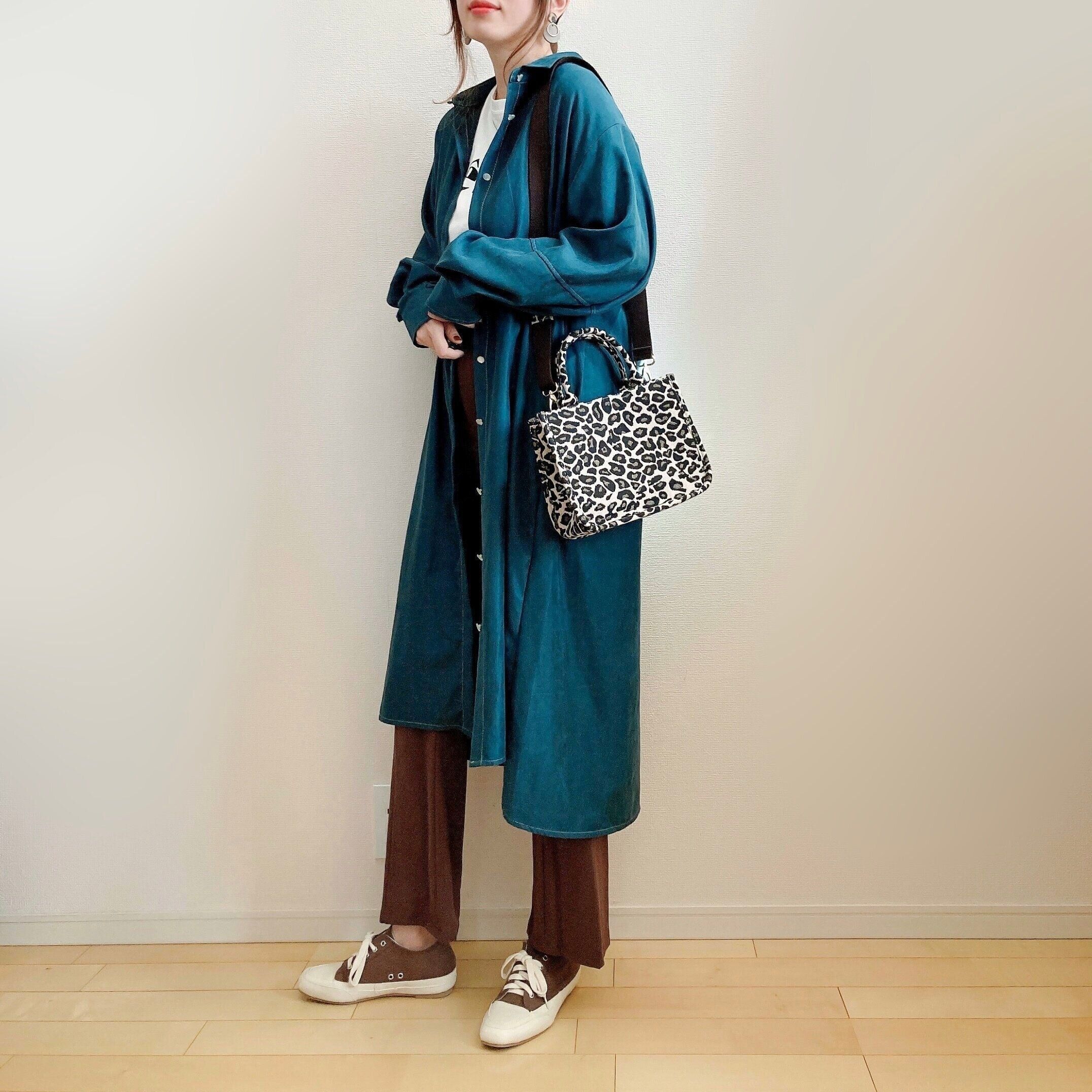 ショルダーベルトで肩掛けしてみました。グリーンのシャツワンピにブラウンのパンツを合わせた秋らしいコーデに、レオパ柄のアクセントが映えます。これからの行楽シーズンにもピッタリの組み合わせです。