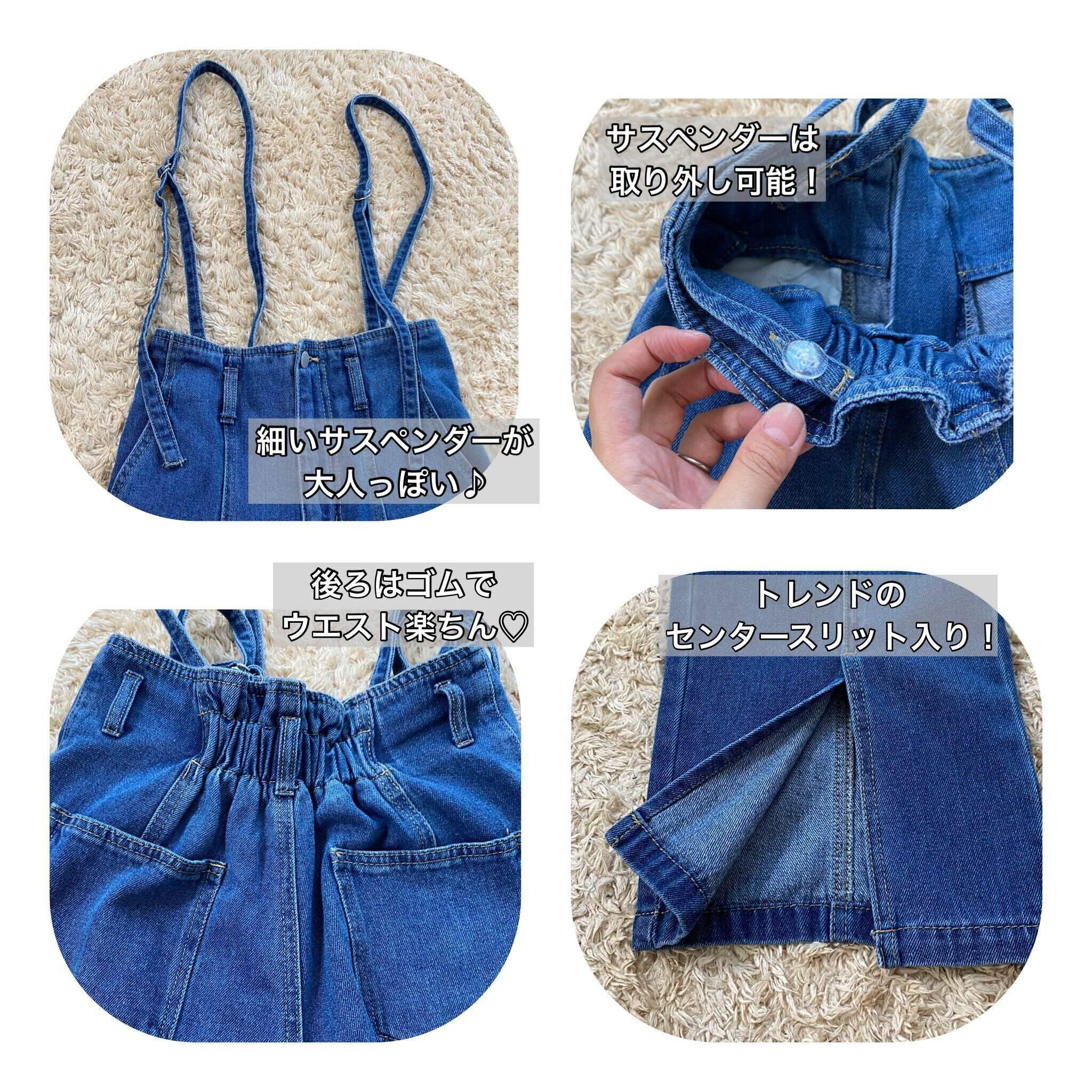 子どもっぽく見えがちなサス付きアイテムですが、こちらは細いサスペンダーで大人っぽく着ることができますよ!センターシームとセンタースリットがトレンド感もあり、ハイウエストなので脚長効果もバッチリ。
