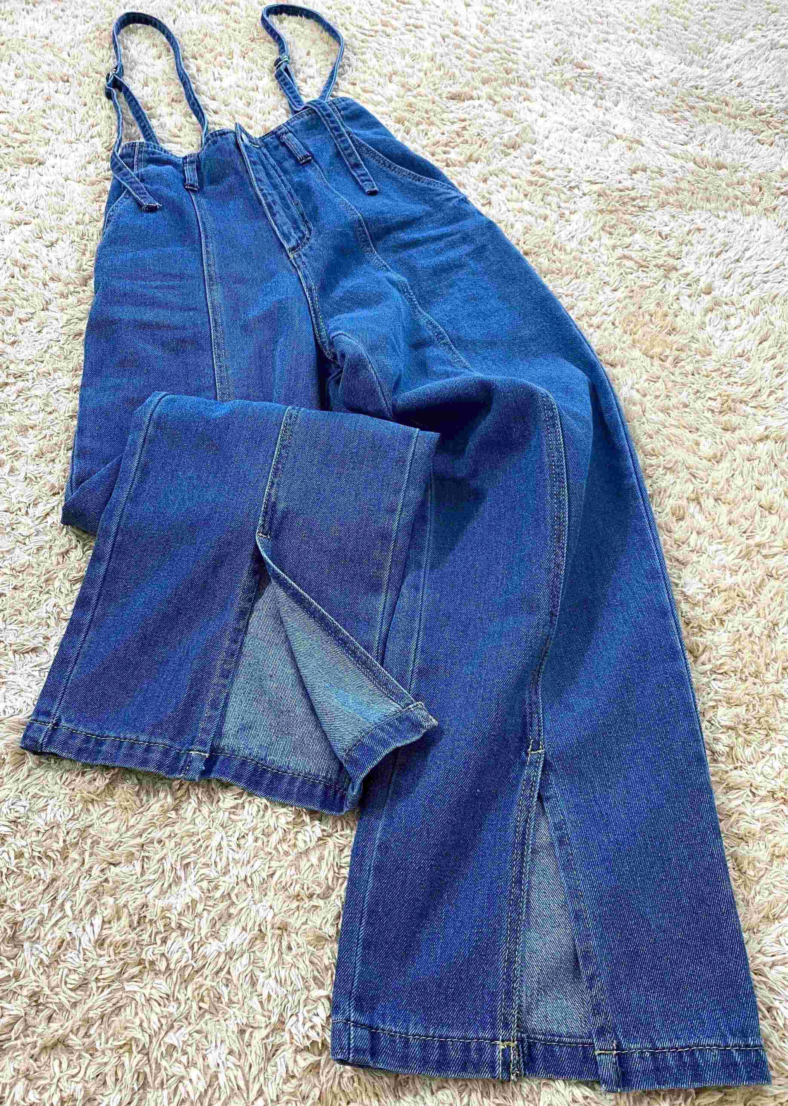 サスペンダー付きのデニムです。ゆったりシルエットで裾にスリットが入っているので少しフレアラインになっています。