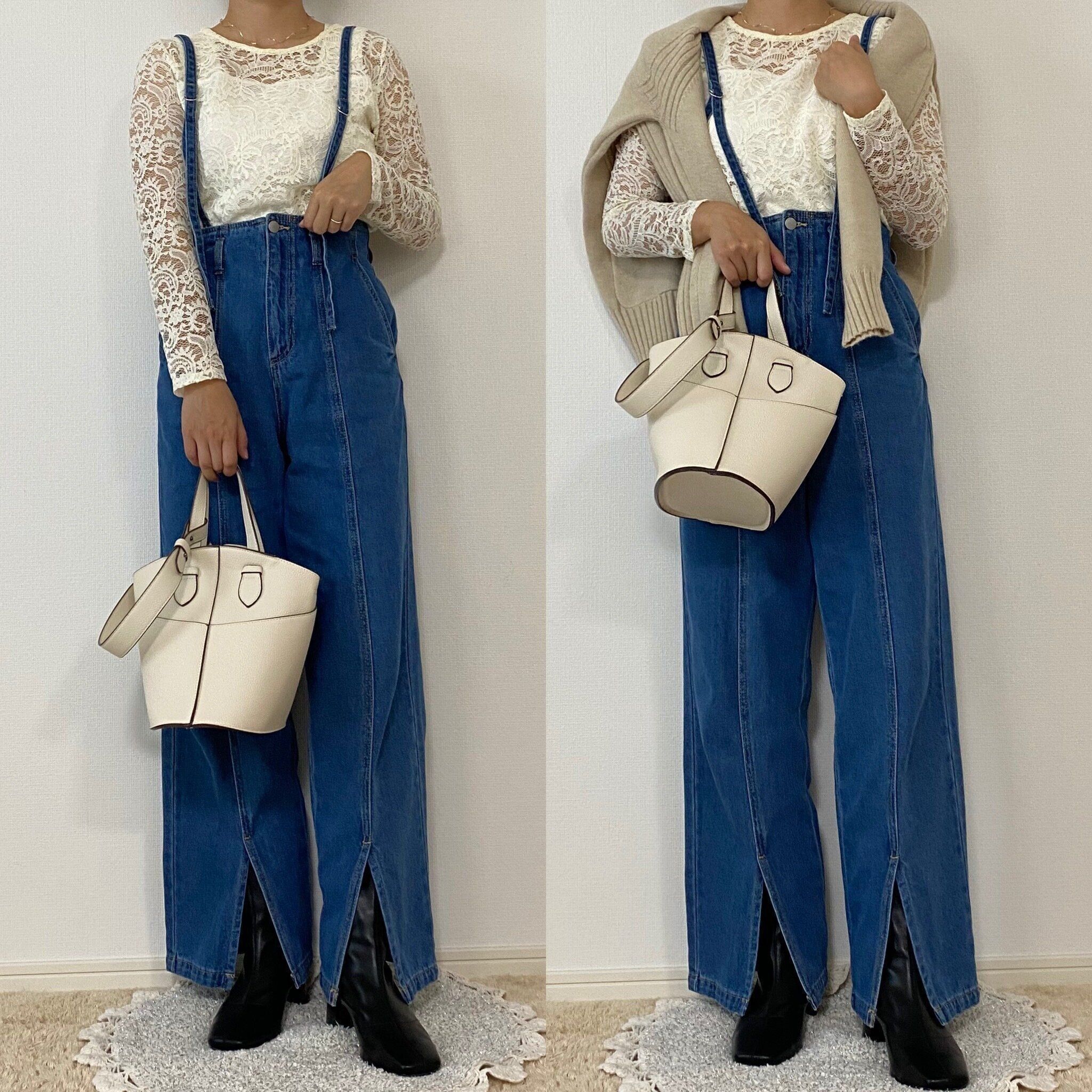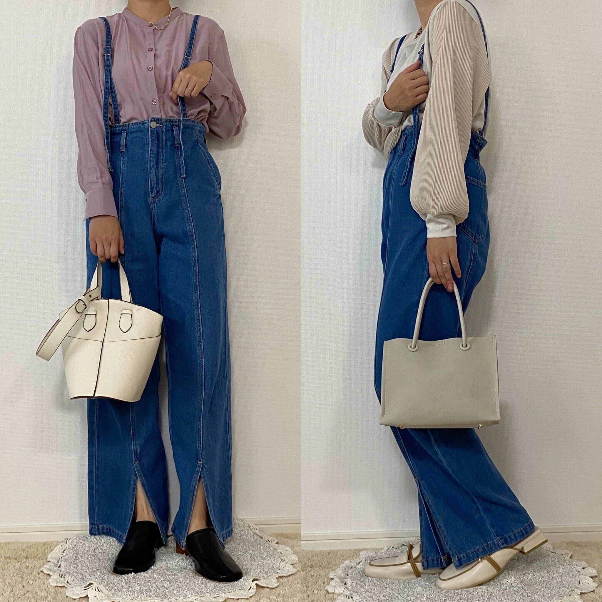 右のコーデは袖にプリーツのデザインが入った上品なトップスに合わせました。その他のアイテムもベージュベースで揃えることで統一感が生まれ、カジュアルなサス付きデニムがレディライクなコーデへ。