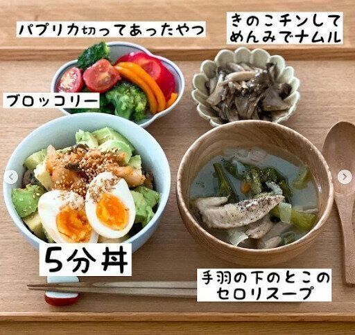 こちらの写真はある日のメニュー。こんなにたくさんの品数なんて無理!と思いがちですが、じつはどんぶり以外はつくり置きメニューなのだそう。そして、どんぶりは名づけて「5分丼」。冷食などをうまく利用しながらチャチャッとつくる工夫をしています。どれもおいしそうですね!