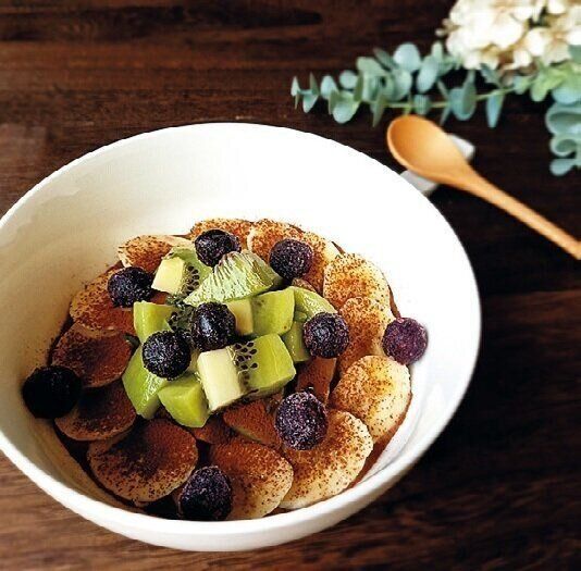 夜、器にオートミール30g、ミルク類(牛乳、豆乳、アーモンドミルクなど)80mlを入れて混ぜ、冷蔵庫でねかす。朝、好みの果物をのせ、ココアパウダーなどをトッピングして完成。
