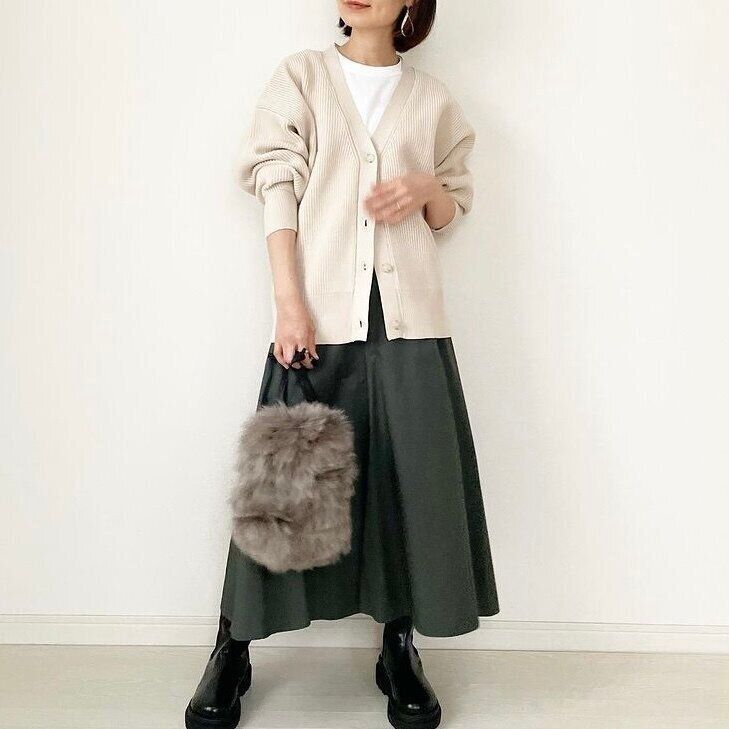 こちらのスカートは、ユニクロユーの「コットンツイルフレアスカート/3,990円」です。ハリ感があり、きれいな広がりあるシルエットがキープできて高見え!コットン素材なので、気負わず履くことができます。長さもあるので、ブーツの長さ問わず合わせやすい点も万能。