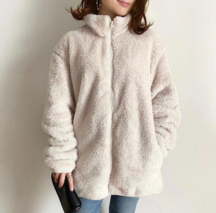 オーバーサイズのフリースジャケットですが、ホワイトをチョイスすれば重たい印象にもなりません。
