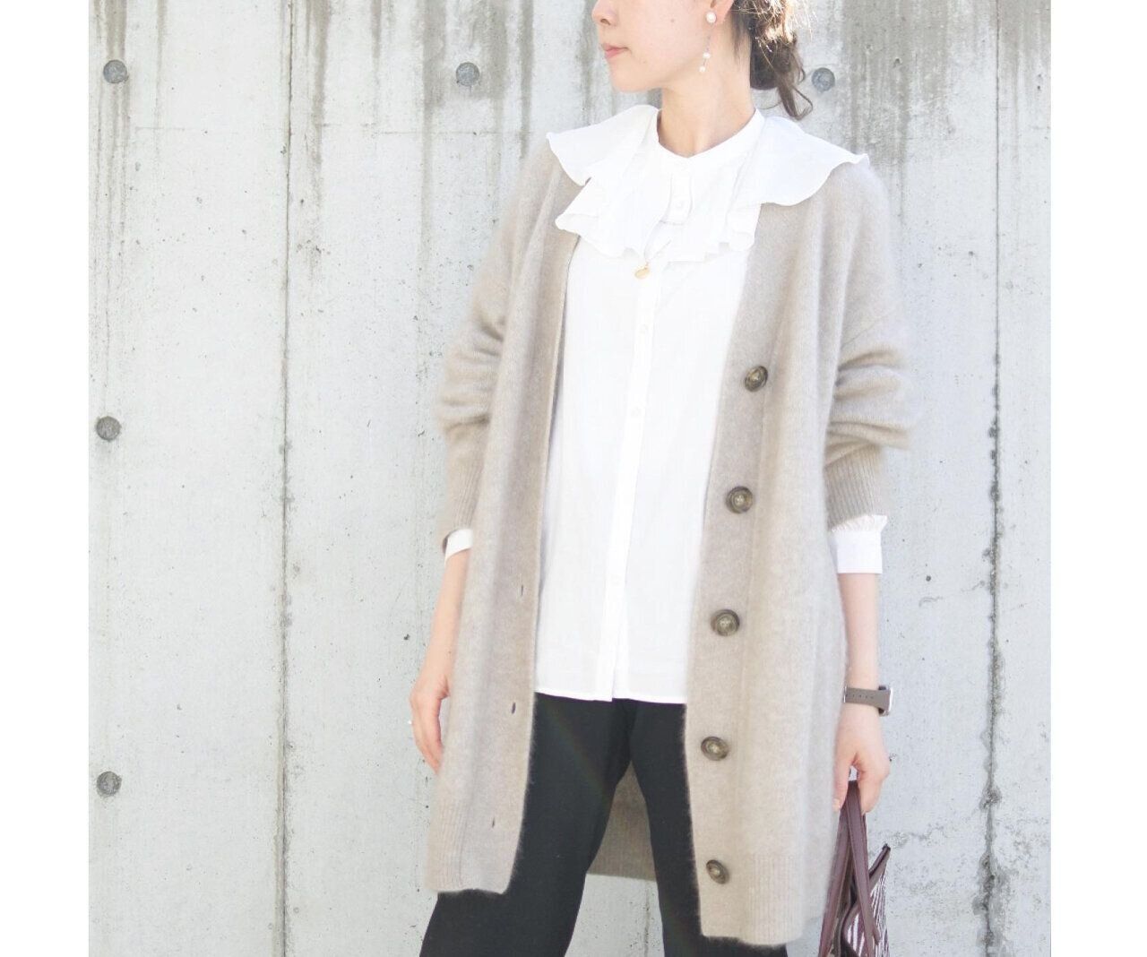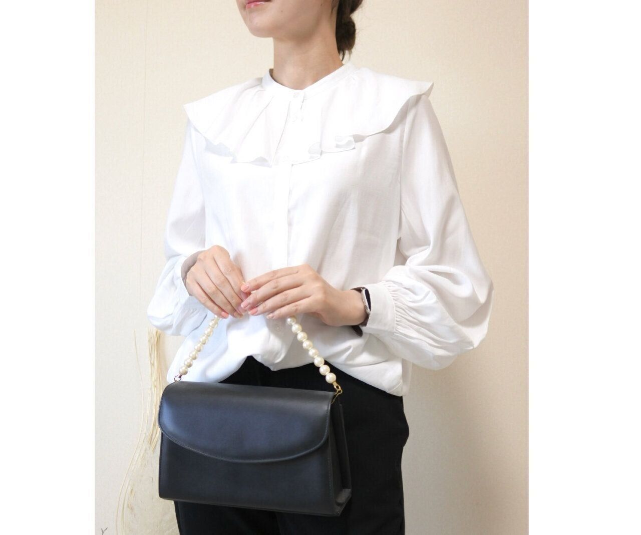 襟元のフリルがかわいらしく、1枚でもカーディガンやニットに重ねてもかわいいデザインです。