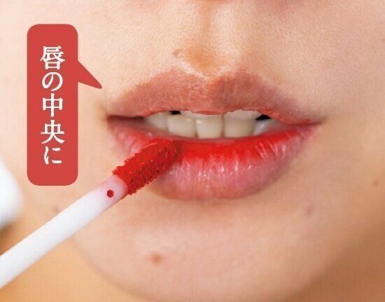 唇の中央に濃い色をのせる。そのまま15秒程度口を開けたままにして色をなじませる。次に唇を合わせ、全体に広げてグラデリップに。