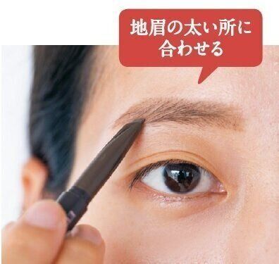 眉は太めの平行眉に仕上げる。眉頭と眉尻がほぼ同じ高さにそろうよう、地眉のいちばん太い所に合わせて眉下を真っすぐ描くとバランスが整う。