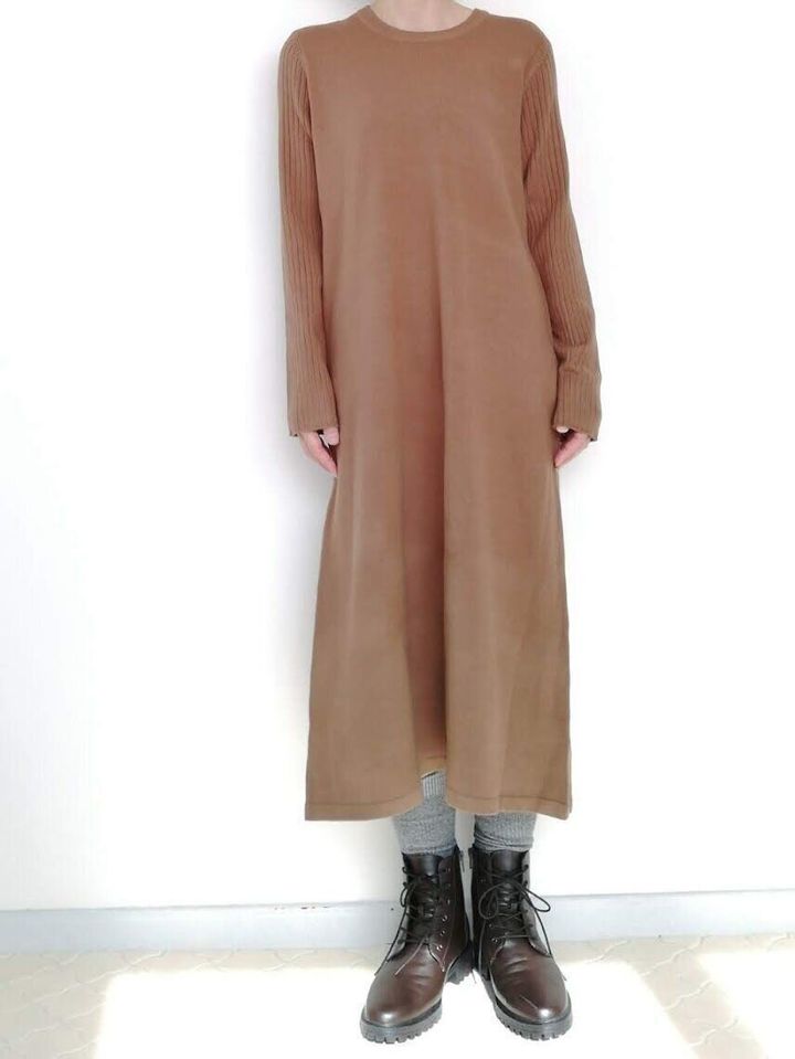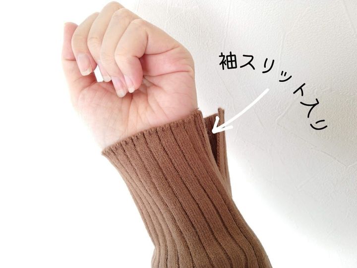ワンピースは、袖がリブの切り替えになっていて、のっぺり見えない工夫が。袖口にスリットが入っているのも、こなれて見えるポイントです!