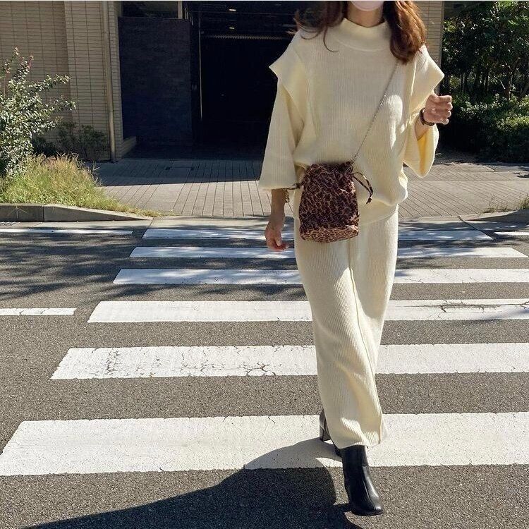 こちらは、ZOZOTOWNで購入できるBONLECILL(ボンルシール)のニットセットアップ、4,890円です。スクエアスリーブになったニットのモード感でセンスアップできて◎。シンプルなデザインなので合わせる小物しだいでアレンジも自在!