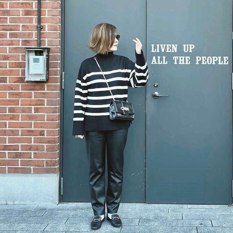 通年人気のボーダーアイテム。冬はニットで取り入れると温かくて上品な印象に。こちらはZARAで購入できる「ボーダーニットセーター」です。ハードに見えがちなレザーパンツも、ボーダーを投入すると程よく肩の力を抜いたスタイルが叶います。