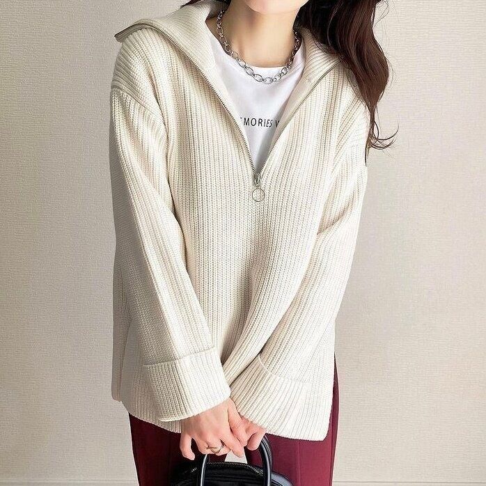GUの「ハーフジップニットチュニック(2,490円)」はトレンドライクなハーフジップがアクセント。袖の折り返しなどディテールも凝っていて◎。合わせやすいベーシックカラーでも十分映える1枚に。