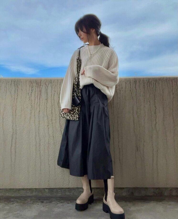 ブラックのスカートと流行のゴツめブーツにホワイトのチャンキーニットハイネックセーターを合わせることで、攻めの中にも女性らしさを取り入れた甘辛ミックスがおしゃれ!
