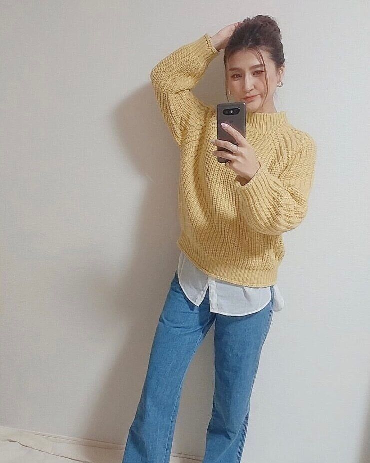 ボリュームのあるニットなのでタイトなデニムを合わせる事でメリハリが出て着やせ効果も期待できます。