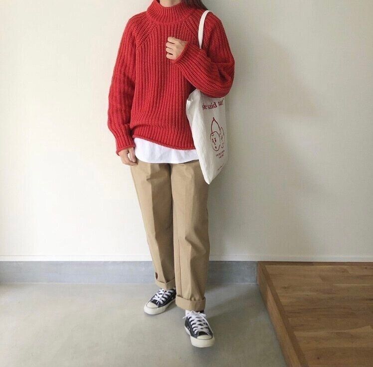 赤みの強いオレンジが特徴のチャンキーニットハイネックセーターにベージュのボトムスを合わせたコーディネートは、ニットがシンプルになりがちなナチュラルなコーディネートのポイントになっていて一気におしゃれ感が増します。