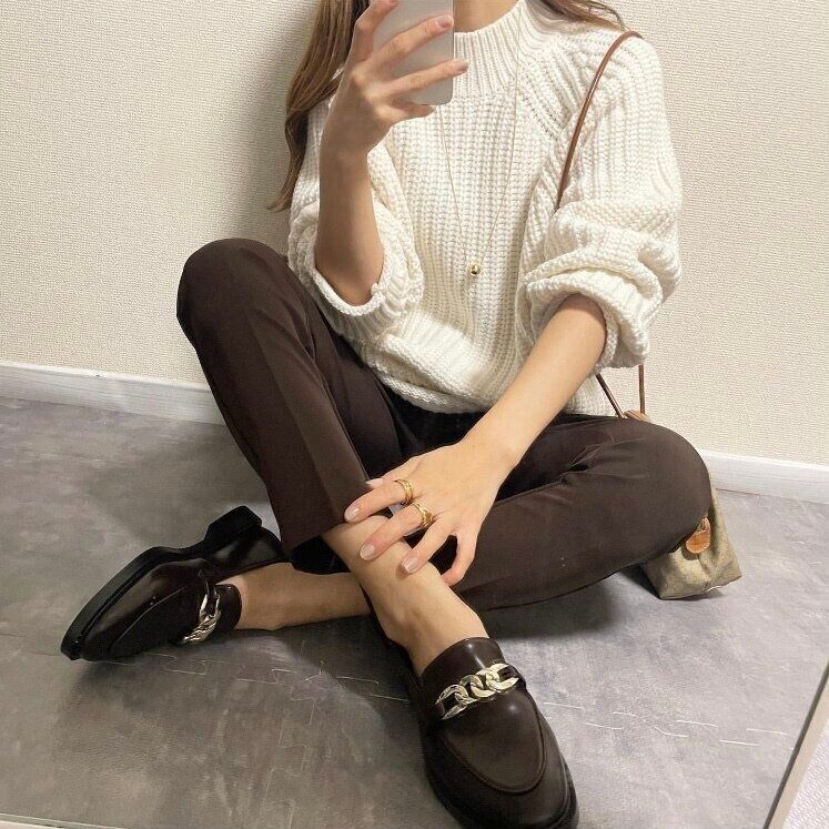 流行のブラウンアイテムにホワイトのチャンキーニットハイネックセーターを合わせたコーディネート。