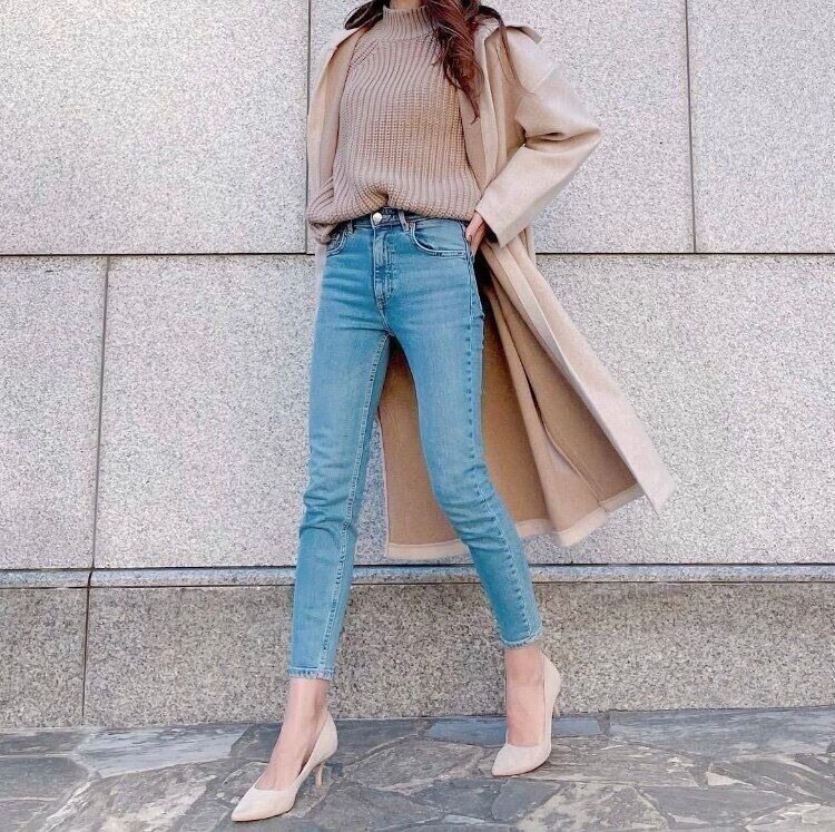 デニムをかっこよく着こなしたい人はベージュのチャンキーニットハイネックセーターがおすすめです。