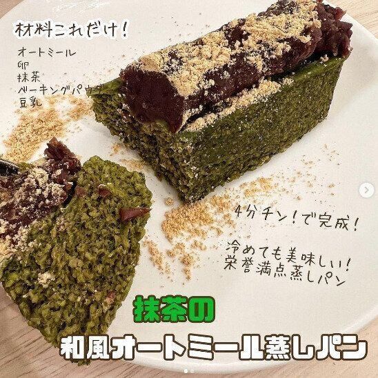 こんなに簡単にできていいの?抹茶好きさんにうれしい「和風オートミール蒸しパン」です。オートミール60g、豆乳90g、卵2個、ラカント15g、抹茶粉7g、ベーキングパウダー5gをよく混ぜてケーキ型に入れ、600wの電子レンジで4分加熱。あんこをのせてできあがり。冷めてもおいしい蒸しパンです。