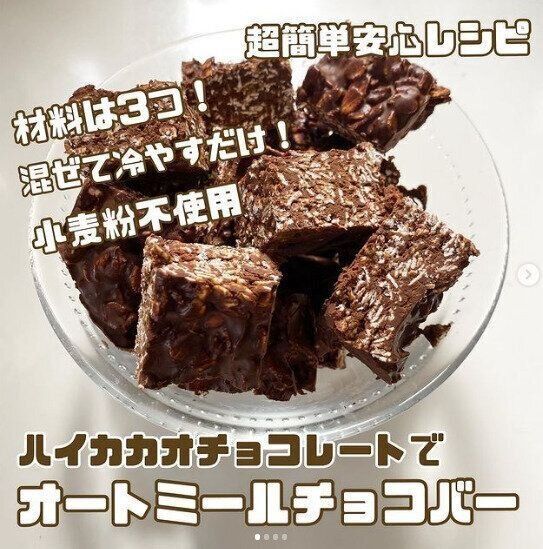 混ぜて冷やすだけの「オートミールチョコバー」です。ダークチョコレート150gをとかし、温めた牛乳150gをよく混ぜて、オートミール150gを入れたら型に流し入れて冷やすだけ。ハイカカオのチョコレートなので運動後のごほうびにもおすすめだそうですよ!