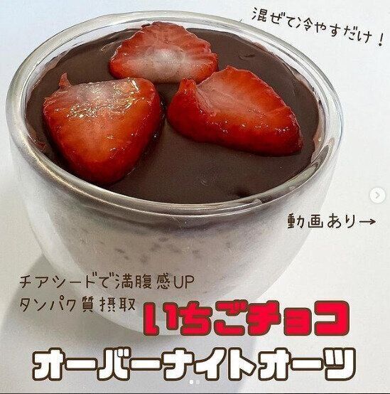 混ぜて冷やすだけの「プロテインオーバーナイトオーツ」です。オートミール30g、チアシード10g、甘いプロテイン25g(今回はブルーベリーチーズケーキ味)、豆乳70gをよく混ぜて冷やすだけ。イチゴ―ソースや、ハイカカオチョコレート、イチゴなどをトッピングすれば完成。オーバーナイトオーツは、オートミールに豆乳などを加えて、好きな味をつけて一晩置くだけでつくれる人気のヘルシーフード。ぜひ試してみたいですね。