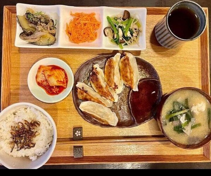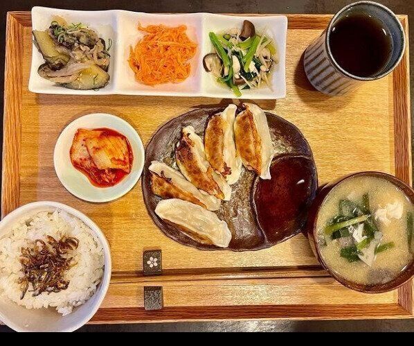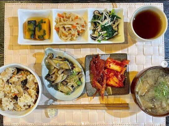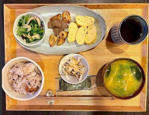 ある日の朝ごはん。何よりもボリュームたっぷりで驚きですよね!雑穀ごはん150gと、かぼちゃと小松菜とえのきの味噌汁、かぶの皮の漬物、だし巻き玉子、こんにゃくとちくわ炒め、壬生菜と本しめじのおひたしに味つけ海苔です。まさに滋味あふれる朝食!ちなみにだし巻き卵はご主人がつくられたものなのだそう。フワフワでおいしそう!朝から心も体も大満足で1日を元気に乗り越えることができそうです。