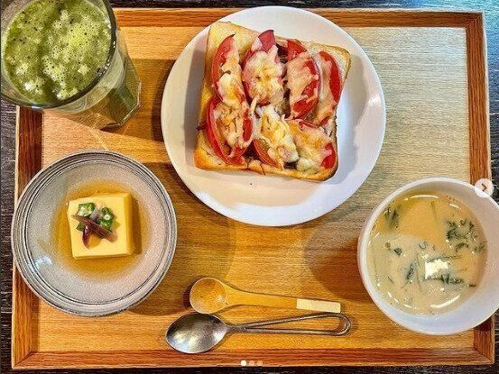 朝はときどきパンの日も。トマトときのこのチーズトースト、卵豆腐、水菜と酒粕の豆乳スープです。朝からいそがしいのにどうやってこんなにつくっているの?と驚きですが、豆乳スープとトーストの具材は前の晩に用意しておいたそう。トーストの具材は、玉ねぎスライスと舞茸を少量のオリーブで炒め、マジックソルトのガーリック味で炒めたものだそう。朝はトマトスライスをのせピザ用チーズをふりかけてトースターで焼くだけ。ちなみに、おいしそうな卵豆腐はご主人のお手製!事前に準備したり、みんなで協力すれば、バタバタの朝を乗り越えて、栄養たっぷりの食事につながります。