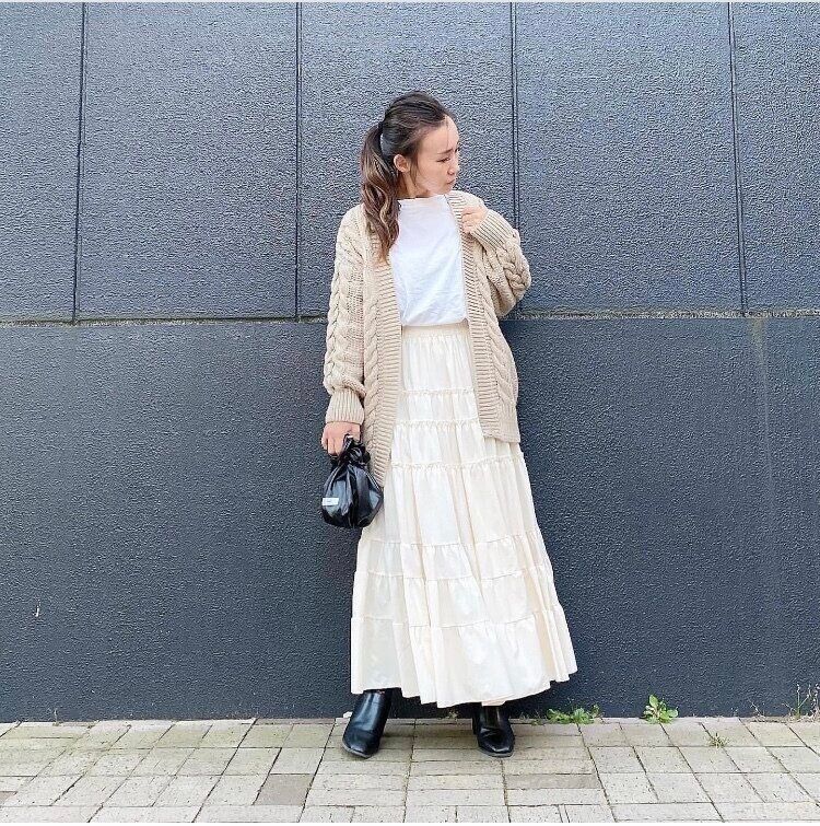 ティアードタイプのロングスカートに同系色のカーディガンを合わせてまとまった印象に見せるテクニックはガーリースタイルのお手本!