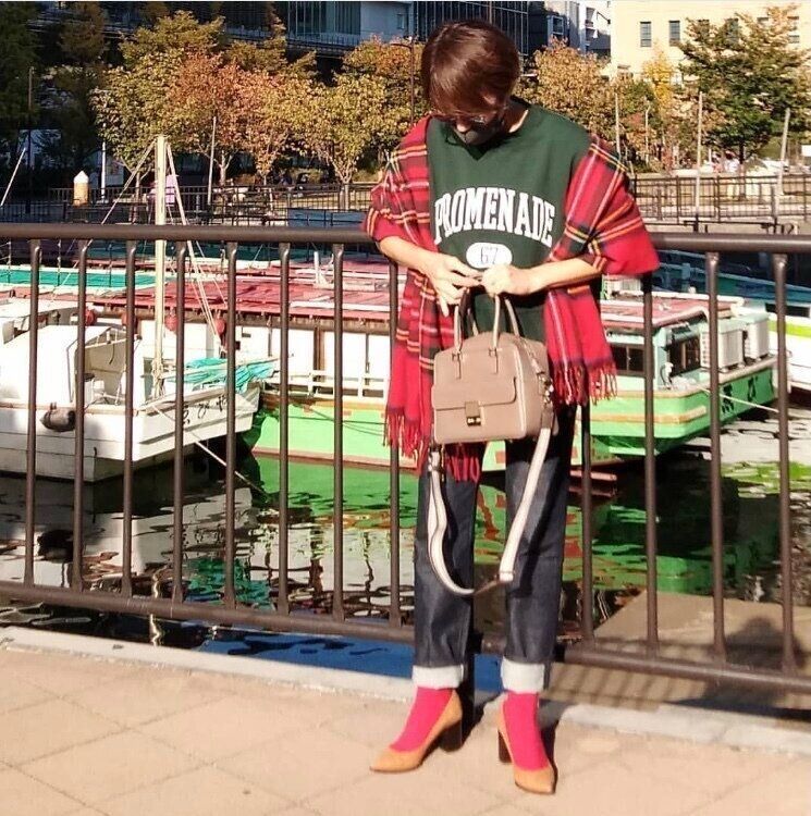 コーディネートの主役級のチェック柄のアウターの個性を際立たせつつも、「スリムストレートハイライズジーンズ」のシルエットの美しさがコーディネートの格上げをしていますよね。
