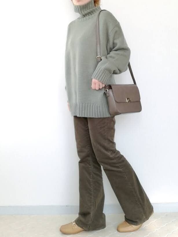 膝から広がるフレアパンツで、すっきり脚長見せ効果を狙いましょう!くすみグリーン×ブラウン系で、落ち着きある大人カジュアルなコーデに。