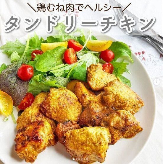 こちらは「鶏むね肉のタンドリーチキン」です。ヨーグルトで漬け込むことで鶏むね肉がしっとりとした仕上がりに。つくり方は、鶏むね肉をひと口大に切り、ケチャップ、無糖ヨーグルト、カレー粉、塩コショウ、にんにく(チューブタイプ)、生姜(チューブタイプ)に30分くらい漬け込みます。弱めの中火でじっくりと焼いて中まで火が通ったら完成!